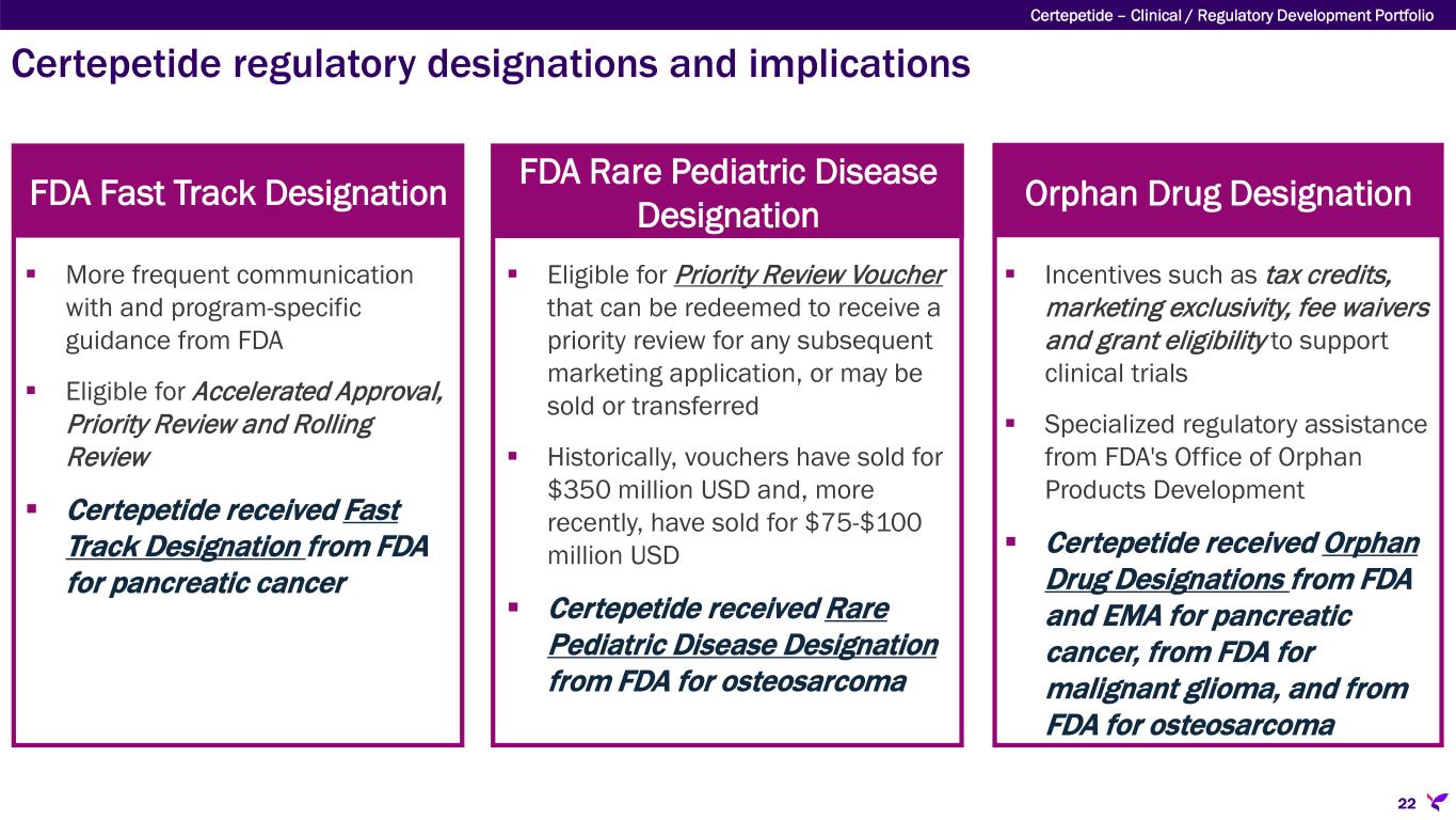 Certepetide – Clinical / Regulatory Development Portfolio Certepetide regulatory designations and implications 22 FDA Fast Track Designation  More frequent communication with and program-specific guidance from FDA  Eligible for Accelerated Approval, Priority Review and Rolling Review  Certepetide received Fast Track Designation from FDA for pancreatic cancer Orphan Drug Designation  Incentives such as tax credits, marketing exclusivity, fee waivers and grant eligibility to support clinical trials  Specialized regulatory assistance from FDA's Office of Orphan Products Development  Certepetide received Orphan Drug Designations from FDA and EMA for pancreatic cancer, from FDA for malignant glioma, and from FDA for osteosarcoma FDA Rare Pediatric Disease Designation  Eligible for Priority Review Voucher that can be redeemed to receive a priority review for any subsequent marketing application, or may be sold or transferred  Historically, vouchers have sold for $350 million USD and, more recently, have sold for $75-$100 million USD  Certepetide received Rare Pediatric Disease Designation from FDA for osteosarcoma