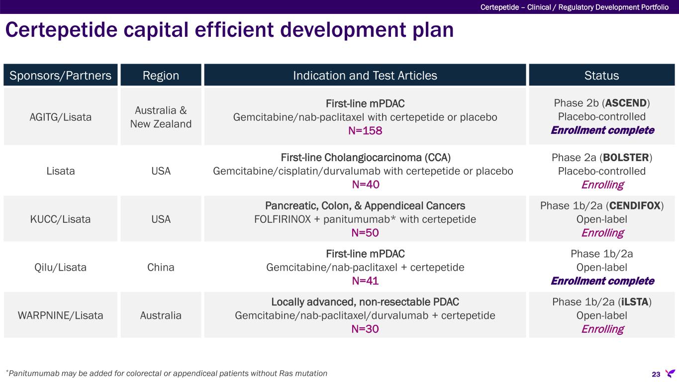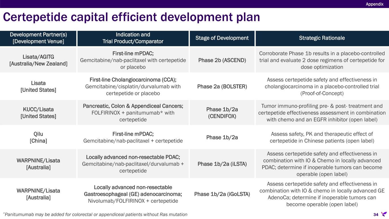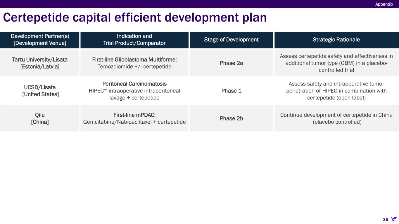 Development Partner(s) [Development Venue] Indication and Trial Product/Comparator Stage of Development Strategic Rationale Lisata/AGITG [Australia/New Zealand] First-line mPDAC; Gemcitabine/nab-paclitaxel with certepetide or placebo Phase 2b (ASCEND) Corroborate Phase 1b results in a placebo-controlled trial and evaluate 2 dose regimens of certepetide for dose optimization Lisata [United States] First-line Cholangiocarcinoma (CCA); Gemcitabine/cisplatin/durvalumab with certepetide or placebo Phase 2a (BOLSTER) Assess certepetide safety and effectiveness in cholangiocarcinoma in a placebo-controlled trial (Proof-of-Concept) KUCC/Lisata [United States] Pancreatic, Colon & Appendiceal Cancers; FOLFIRINOX + panitumumab* with certepetide Phase 1b/2a (CENDIFOX) Tumor immuno-profiling pre- & post- treatment and certepetide effectiveness assessment in combination with chemo and an EGFR inhibitor (open label) Qilu [China] First-line mPDAC; Gemcitabine/nab-paclitaxel + certepetide Phase 1b/2a Assess safety, PK and therapeutic effect of certepetide in Chinese patients (open label) WARPNINE/Lisata [Australia] Locally advanced non-resectable PDAC; Gemcitabine/nab-paclitaxel/durvalumab + certepetide Phase 1b/2a (iLSTA) Assess certepetide safety and effectiveness in combination with IO & Chemo in locally advanced PDAC; determine if inoperable tumors can become operable (open label) WARPNINE/Lisata [Australia] Locally advanced non-resectable Gastroesophageal (GE) adenocarcinoma; Nivolumab/FOLFIRINOX + certepetide Phase 1b/2a (iGoLSTA) Assess certepetide safety and effectiveness in combination with IO & chemo in locally advanced GE AdenoCa; determine if inoperable tumors can become operable (open label) *Panitumumab may be added for colorectal or appendiceal patients without Ras mutation Appendix Certepetide capital efficient development plan 34