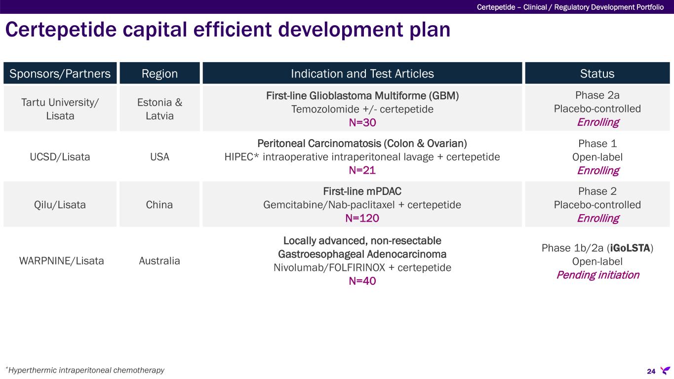 *Panitumumab may be added for colorectal or appendiceal patients without Ras mutation First-line mPDAC Gemcitabine/nab-paclitaxel with certepetide or placebo N=158 AGITG/Lisata Phase 2b (ASCEND) Placebo-controlled Enrollment complete Australia & New Zealand First-line Cholangiocarcinoma (CCA) Gemcitabine/cisplatin/durvalumab with certepetide or placebo N=40 Lisata Phase 2a (BOLSTER) Placebo-controlled Enrolling USA Pancreatic, Colon, & Appendiceal Cancers FOLFIRINOX + panitumumab* with certepetide N=50 KUCC/Lisata Phase 1b/2a (CENDIFOX) Open-label Enrolling USA First-line mPDAC Gemcitabine/nab-paclitaxel + certepetide N=41 Qilu/Lisata Phase 1b/2a Open-label Enrollment complete China Locally advanced, non-resectable PDAC Gemcitabine/nab-paclitaxel/durvalumab + certepetide N=30 WARPNINE/Lisata Phase 1b/2a (iLSTA) Open-label Enrolling Australia Sponsors/Partners Region Indication and Test Articles Status 23 Certepetide capital efficient development plan Certepetide – Clinical / Regulatory Development Portfolio