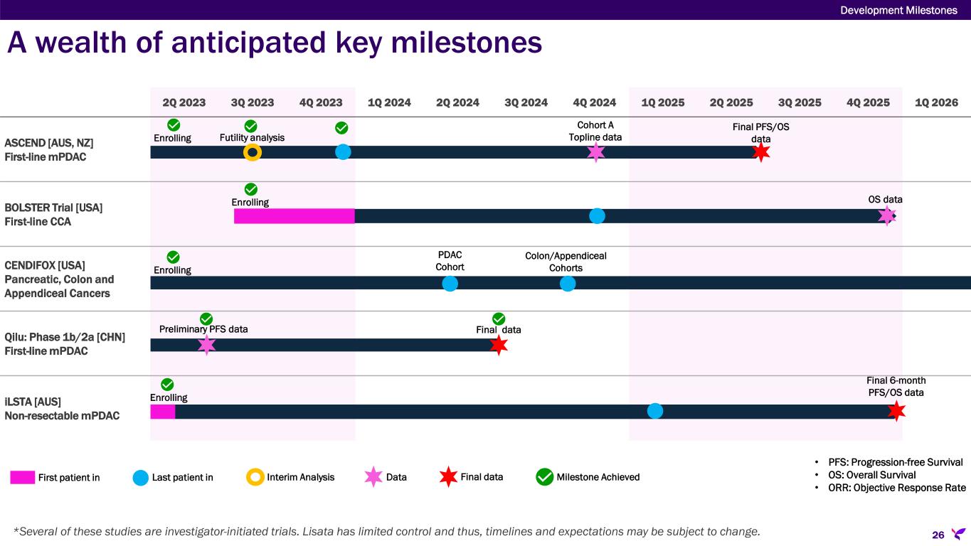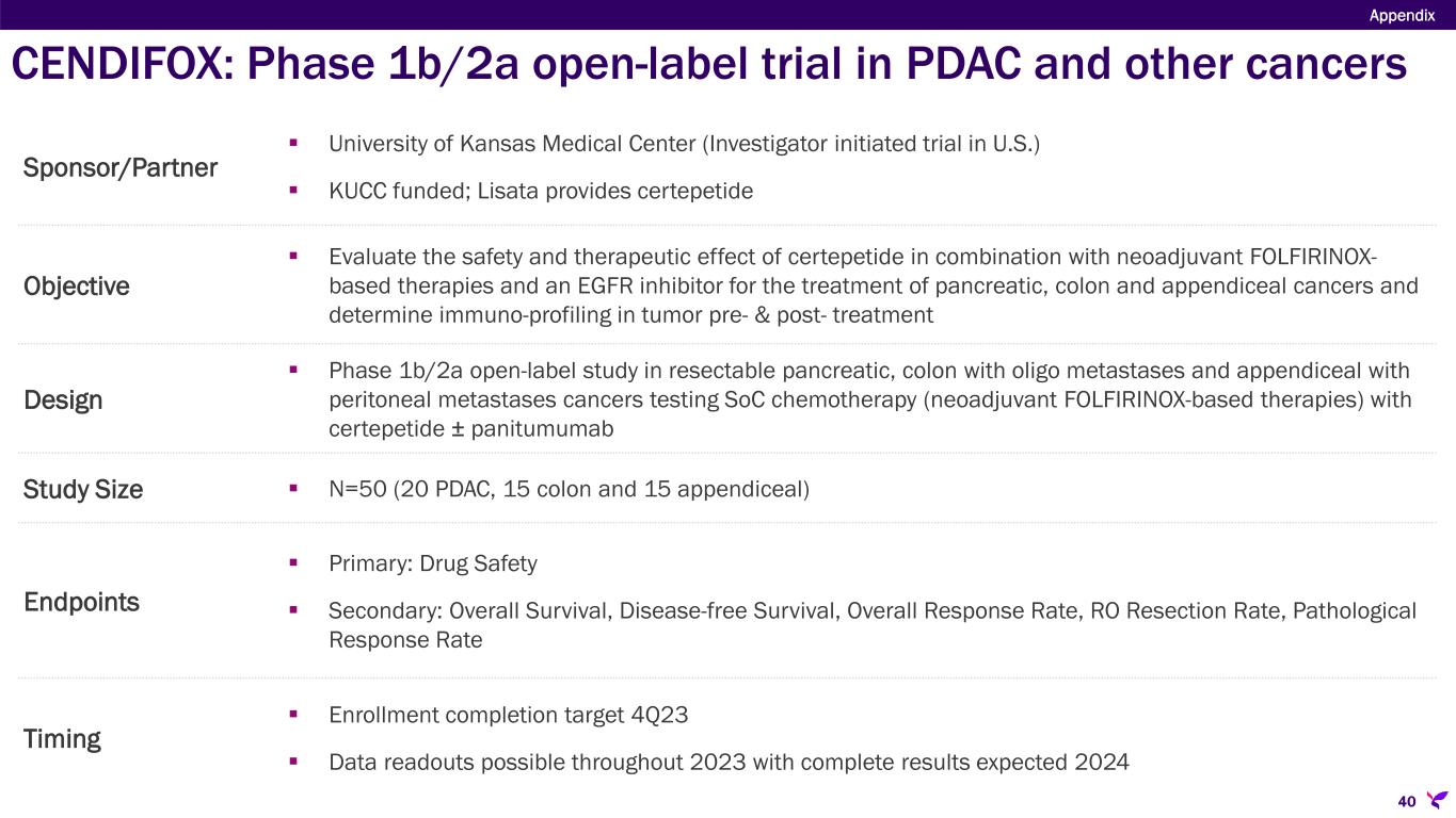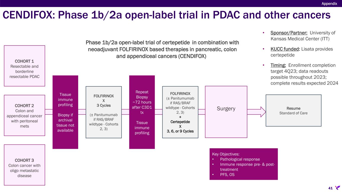 Sponsor/Partner  University of Kansas Medical Center (Investigator initiated trial in U.S.)  KUCC funded; Lisata provides certepetide Objective  Evaluate the safety and therapeutic effect of certepetide in combination with neoadjuvant FOLFIRINOX- based therapies and an EGFR inhibitor for the treatment of pancreatic, colon and appendiceal cancers and determine immuno-profiling in tumor pre- & post- treatment Design  Phase 1b/2a open-label study in resectable pancreatic, colon with oligo metastases and appendiceal with peritoneal metastases cancers testing SoC chemotherapy (neoadjuvant FOLFIRINOX-based therapies) with certepetide ± panitumumab Study Size  N=50 (20 PDAC, 15 colon and 15 appendiceal) Endpoints  Primary: Drug Safety  Secondary: Overall Survival, Disease-free Survival, Overall Response Rate, RO Resection Rate, Pathological Response Rate Timing  Enrollment completion target 4Q23  Data readouts possible throughout 2023 with complete results expected 2024 CENDIFOX: Phase 1b/2a open-label trial in PDAC and other cancers Appendix 40