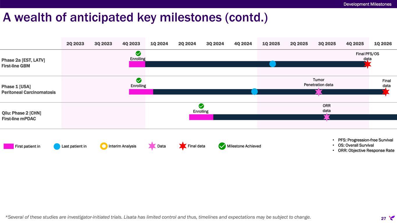 A wealth of anticipated key milestones 26 2Q 2023 3Q 2023 4Q 2023 1Q 2024 2Q 2024 3Q 2024 4Q 2024 1Q 2025 2Q 2025 3Q 2025 4Q 2025 1Q 2026 ASCEND [AUS, NZ] First-line mPDAC BOLSTER Trial [USA] First-line CCA CENDIFOX [USA] Pancreatic, Colon and Appendiceal Cancers Qilu: Phase 1b/2a [CHN] First-line mPDAC iLSTA [AUS] Non-resectable mPDAC Futility analysis OS data Colon/Appendiceal Cohorts PDAC Cohort Cohort A Topline data Preliminary PFS data Final PFS/OS data Final data Final 6-month PFS/OS data • PFS: Progression-free Survival • OS: Overall Survival • ORR: Objective Response Rate Enrolling First patient in Last patient in Interim Analysis Data Final data Milestone Achieved Enrolling Enrolling Enrolling Development Milestones *Several of these studies are investigator-initiated trials. Lisata has limited control and thus, timelines and expectations may be subject to change.
