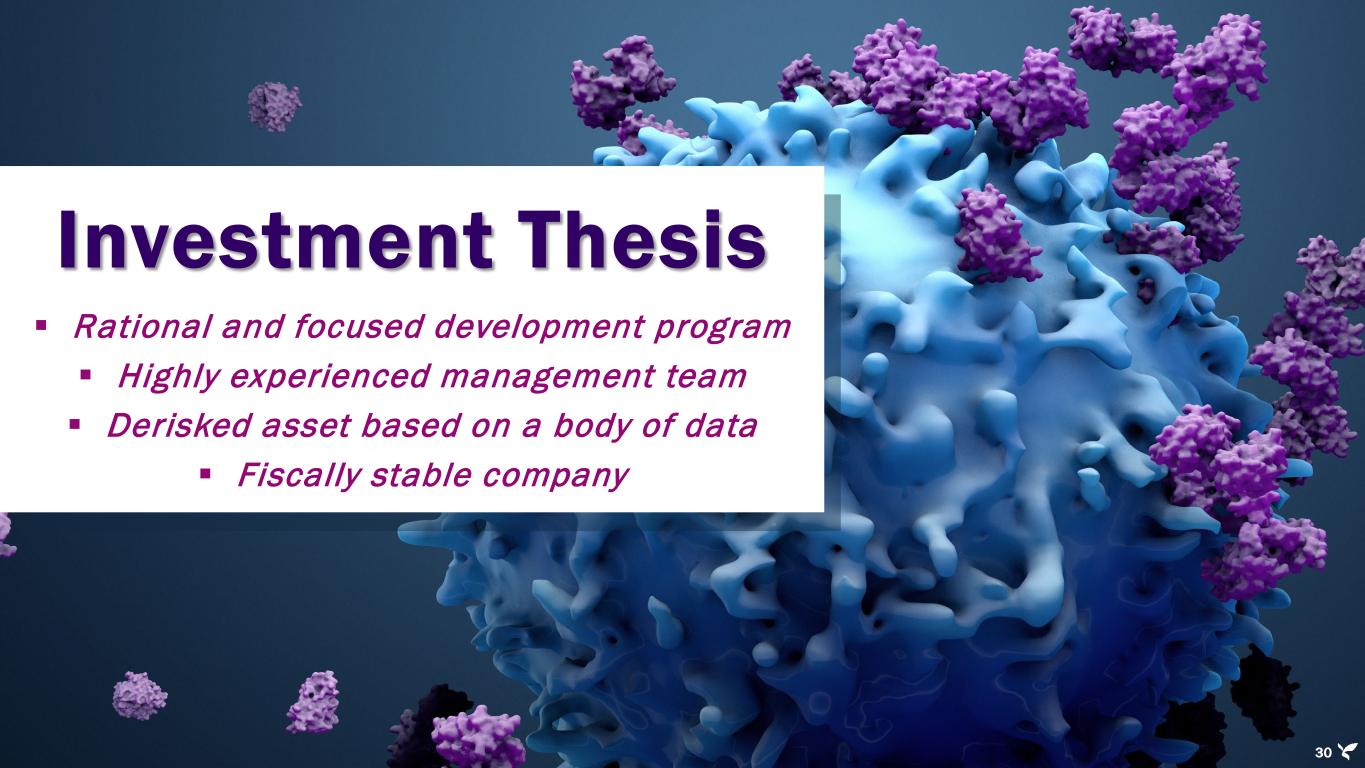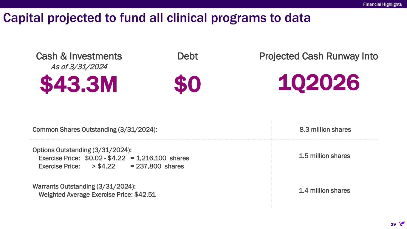 Capital projected to fund all clinical programs to data Financial Highlights 29 $43.3M Cash & Investments As of 3/31/2024 $0 Debt 1Q2026 Projected Cash Runway Into Common Shares Outstanding (3/31/2024): 8.3 million shares Options Outstanding (3/31/2024): Exercise Price: $0.02 - $4.22 = 1,216,100 shares Exercise Price: > $4.22 = 237,800 shares 1.5 million shares Warrants Outstanding (3/31/2024): Weighted Average Exercise Price: $42.51 1.4 million shares