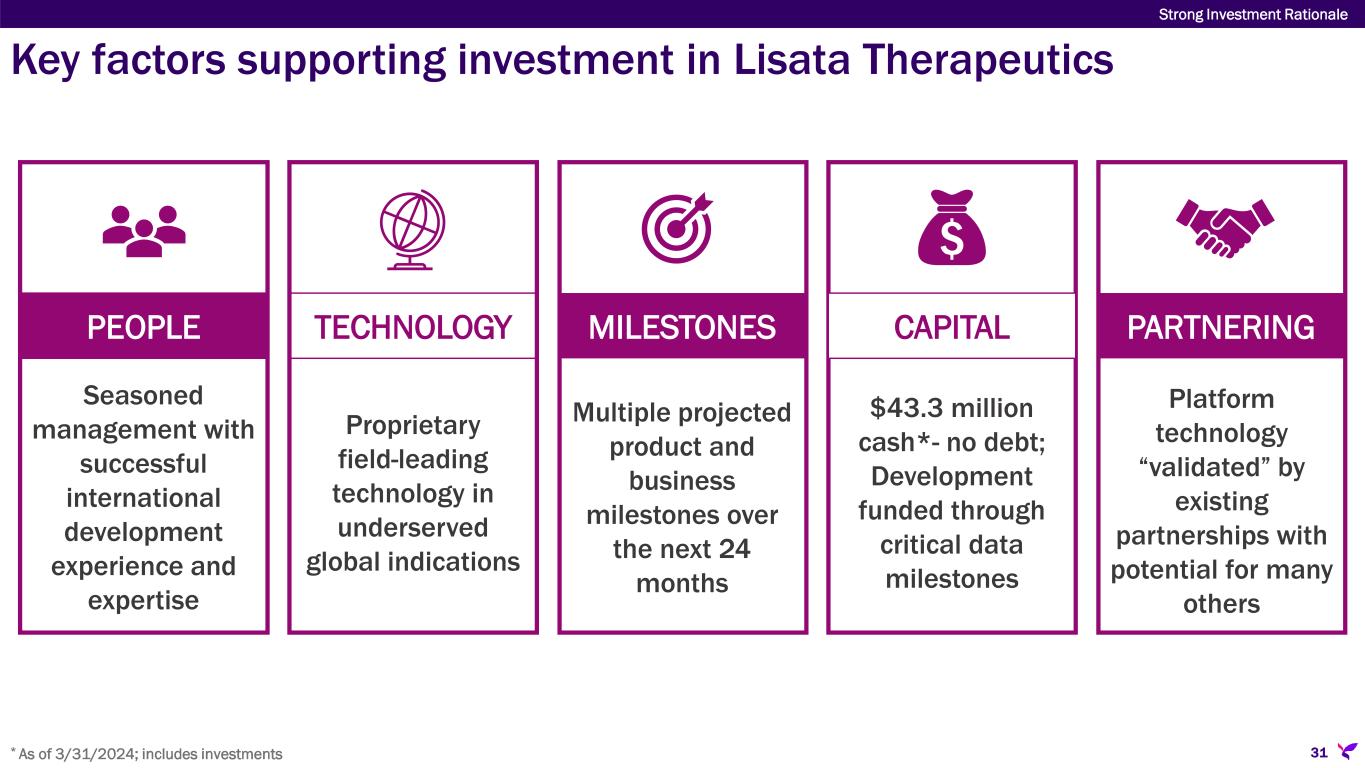 * As of 3/31/2024; includes investments Key factors supporting investment in Lisata Therapeutics 31 Strong Investment Rationale PEOPLE Seasoned management with successful international development experience and expertise TECHNOLOGY Proprietary field-leading technology in underserved global indications MILESTONES Multiple projected product and business milestones over the next 24 months CAPITAL $43.3 million cash*- no debt; Development funded through critical data milestones PARTNERING Platform technology “validated” by existing partnerships with potential for many others