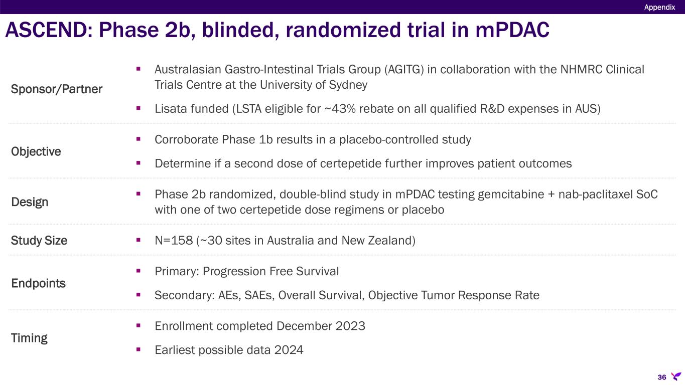 Development Partner(s) [Development Venue] Indication and Trial Product/Comparator Stage of Development Strategic Rationale Tartu University/Lisata [Estonia/Latvia] First-line Glioblastoma Multiforme; Temozolomide +/- certepetide Phase 2a Assess certepetide safety and effectiveness in additional tumor type (GBM) in a placebo- controlled trial UCSD/Lisata [United States] Peritoneal Carcinomatosis HIPEC* intraoperative intraperitoneal lavage + certepetide Phase 1 Assess safety and intraoperative tumor penetration of HIPEC in combination with certepetide (open label) Qilu [China] First-line mPDAC; Gemcitabine/Nab-paclitaxel + certepetide Phase 2b Continue development of certepetide in China (placebo controlled) 35 Certepetide capital efficient development plan Appendix