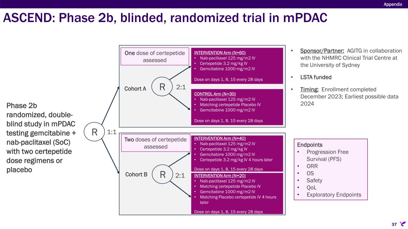 Sponsor/Partner  Australasian Gastro-Intestinal Trials Group (AGITG) in collaboration with the NHMRC Clinical Trials Centre at the University of Sydney  Lisata funded (LSTA eligible for ~43% rebate on all qualified R&D expenses in AUS) Objective  Corroborate Phase 1b results in a placebo-controlled study  Determine if a second dose of certepetide further improves patient outcomes Design  Phase 2b randomized, double-blind study in mPDAC testing gemcitabine + nab-paclitaxel SoC with one of two certepetide dose regimens or placebo Study Size  N=158 (~30 sites in Australia and New Zealand) Endpoints  Primary: Progression Free Survival  Secondary: AEs, SAEs, Overall Survival, Objective Tumor Response Rate Timing  Enrollment completed December 2023  Earliest possible data 2024 ASCEND: Phase 2b, blinded, randomized trial in mPDAC 36 Appendix