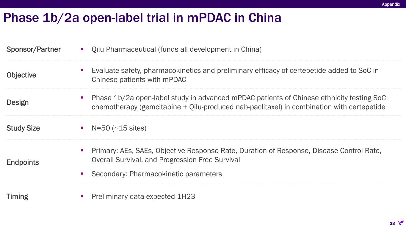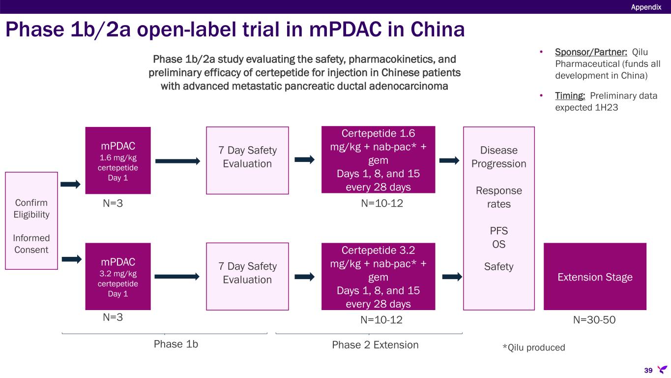 Sponsor/Partner  Qilu Pharmaceutical (funds all development in China) Objective  Evaluate safety, pharmacokinetics and preliminary efficacy of certepetide added to SoC in Chinese patients with mPDAC Design  Phase 1b/2a open-label study in advanced mPDAC patients of Chinese ethnicity testing SoC chemotherapy (gemcitabine + Qilu-produced nab-paclitaxel) in combination with certepetide Study Size  N=50 (~15 sites) Endpoints  Primary: AEs, SAEs, Objective Response Rate, Duration of Response, Disease Control Rate, Overall Survival, and Progression Free Survival  Secondary: Pharmacokinetic parameters Timing  Preliminary data expected 1H23 Appendix 38 Phase 1b/2a open-label trial in mPDAC in China