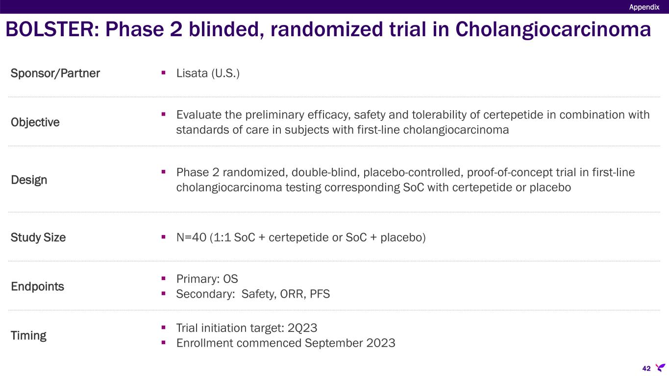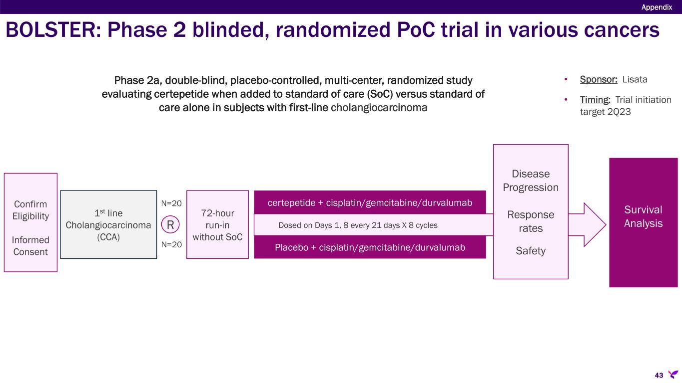 Sponsor/Partner  Lisata (U.S.) Objective  Evaluate the preliminary efficacy, safety and tolerability of certepetide in combination with standards of care in subjects with first-line cholangiocarcinoma Design  Phase 2 randomized, double-blind, placebo-controlled, proof-of-concept trial in first-line cholangiocarcinoma testing corresponding SoC with certepetide or placebo Study Size  N=40 (1:1 SoC + certepetide or SoC + placebo) Endpoints  Primary: OS  Secondary: Safety, ORR, PFS Timing  Trial initiation target: 2Q23  Enrollment commenced September 2023 BOLSTER: Phase 2 blinded, randomized trial in Cholangiocarcinoma Appendix 42