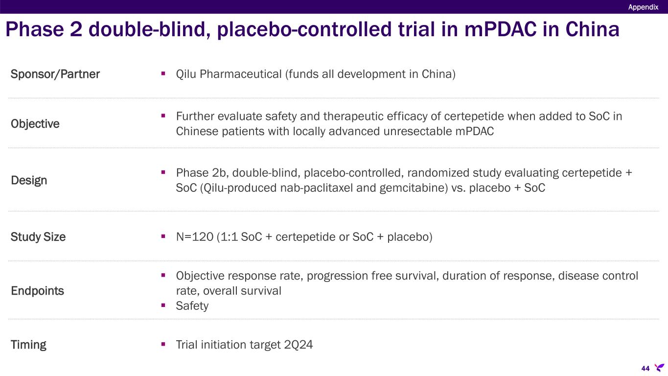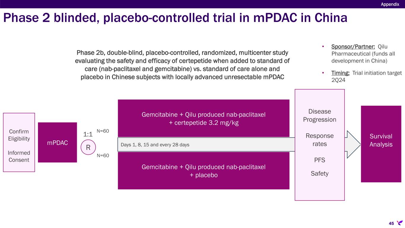 Sponsor/Partner  Qilu Pharmaceutical (funds all development in China) Objective  Further evaluate safety and therapeutic efficacy of certepetide when added to SoC in Chinese patients with locally advanced unresectable mPDAC Design  Phase 2b, double-blind, placebo-controlled, randomized study evaluating certepetide + SoC (Qilu-produced nab-paclitaxel and gemcitabine) vs. placebo + SoC Study Size  N=120 (1:1 SoC + certepetide or SoC + placebo) Endpoints  Objective response rate, progression free survival, duration of response, disease control rate, overall survival  Safety Timing  Trial initiation target 2Q24 Appendix 44 Phase 2 double-blind, placebo-controlled trial in mPDAC in China