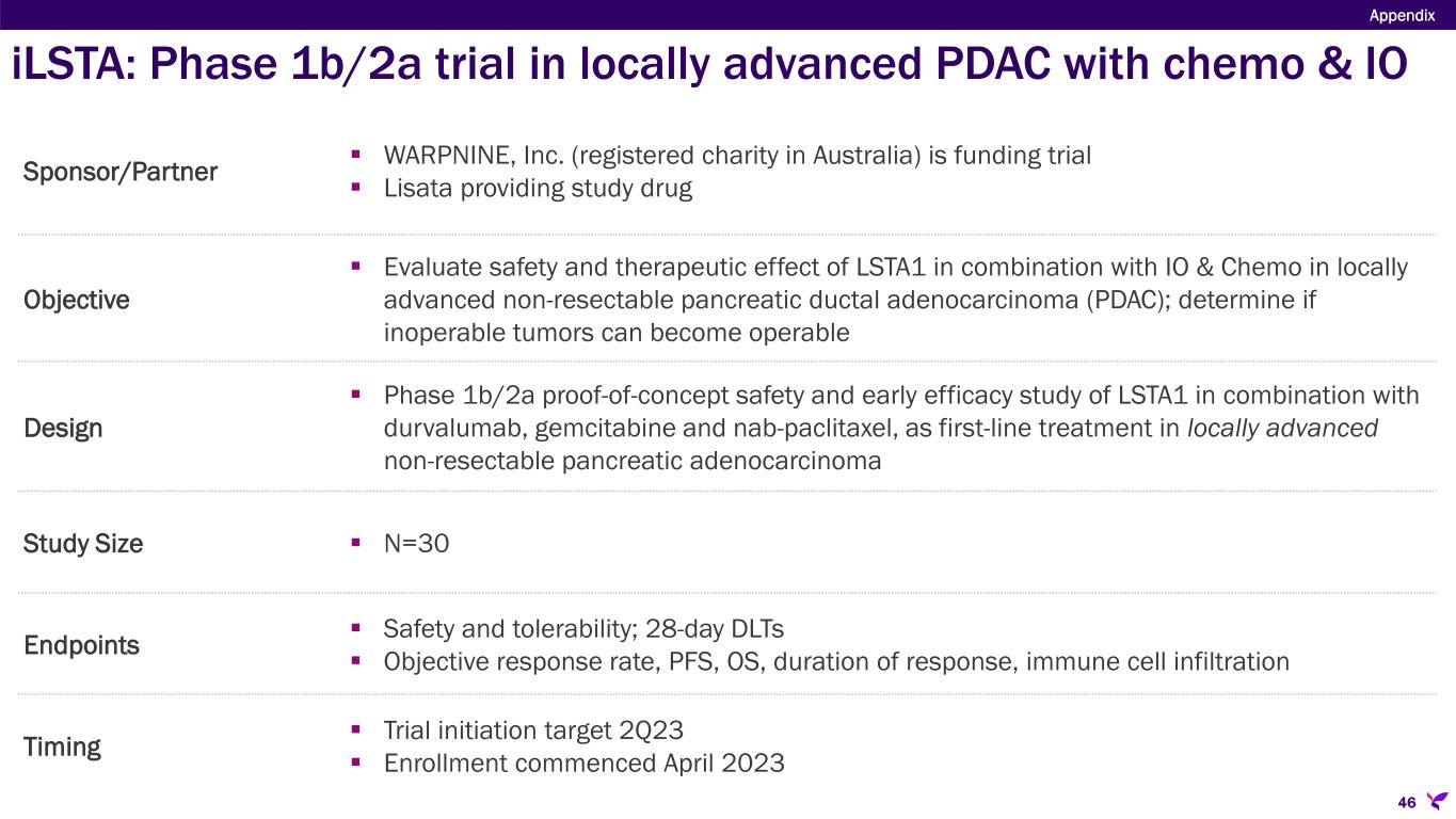Sponsor/Partner  WARPNINE, Inc. (registered charity in Australia) is funding trial  Lisata providing study drug Objective  Evaluate safety and therapeutic effect of LSTA1 in combination with IO & Chemo in locally advanced non-resectable pancreatic ductal adenocarcinoma (PDAC); determine if inoperable tumors can become operable Design  Phase 1b/2a proof-of-concept safety and early efficacy study of LSTA1 in combination with durvalumab, gemcitabine and nab-paclitaxel, as first-line treatment in locally advanced non-resectable pancreatic adenocarcinoma Study Size  N=30 Endpoints  Safety and tolerability; 28-day DLTs  Objective response rate, PFS, OS, duration of response, immune cell infiltration Timing  Trial initiation target 2Q23  Enrollment commenced April 2023 Appendix 46 iLSTA: Phase 1b/2a trial in locally advanced PDAC with chemo & IO