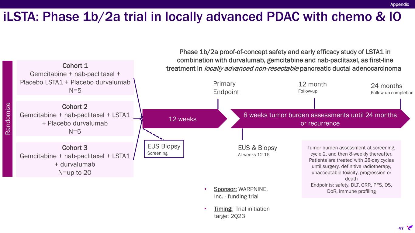 Cohort 2 Gemcitabine + nab-paclitaxel + LSTA1 + Placebo durvalumab N=5 Cohort 1 Gemcitabine + nab-paclitaxel + Placebo LSTA1 + Placebo durvalumab N=5 Cohort 3 Gemcitabine + nab-paclitaxel + LSTA1 + durvalumab N=up to 20 12 weeks 8 weeks tumor burden assessments until 24 months or recurrence 12 month Follow-up Primary Endpoint 24 months Follow-up completion EUS Biopsy Screening EUS & Biopsy At weeks 12-16 Tumor burden assessment at screening, cycle 2, and then 8-weekly thereafter. Patients are treated with 28-day cycles until surgery, definitive radiotherapy, unacceptable toxicity, progression or death Endpoints: safety, DLT, ORR, PFS, OS, DoR, immune profiling Ra nd om iz e Phase 1b/2a proof-of-concept safety and early efficacy study of LSTA1 in combination with durvalumab, gemcitabine and nab-paclitaxel, as first-line treatment in locally advanced non-resectable pancreatic ductal adenocarcinoma • Sponsor: WARPNINE, Inc. - funding trial • Timing: Trial initiation target 2Q23 Appendix 47 iLSTA: Phase 1b/2a trial in locally advanced PDAC with chemo & IO