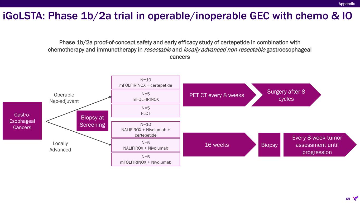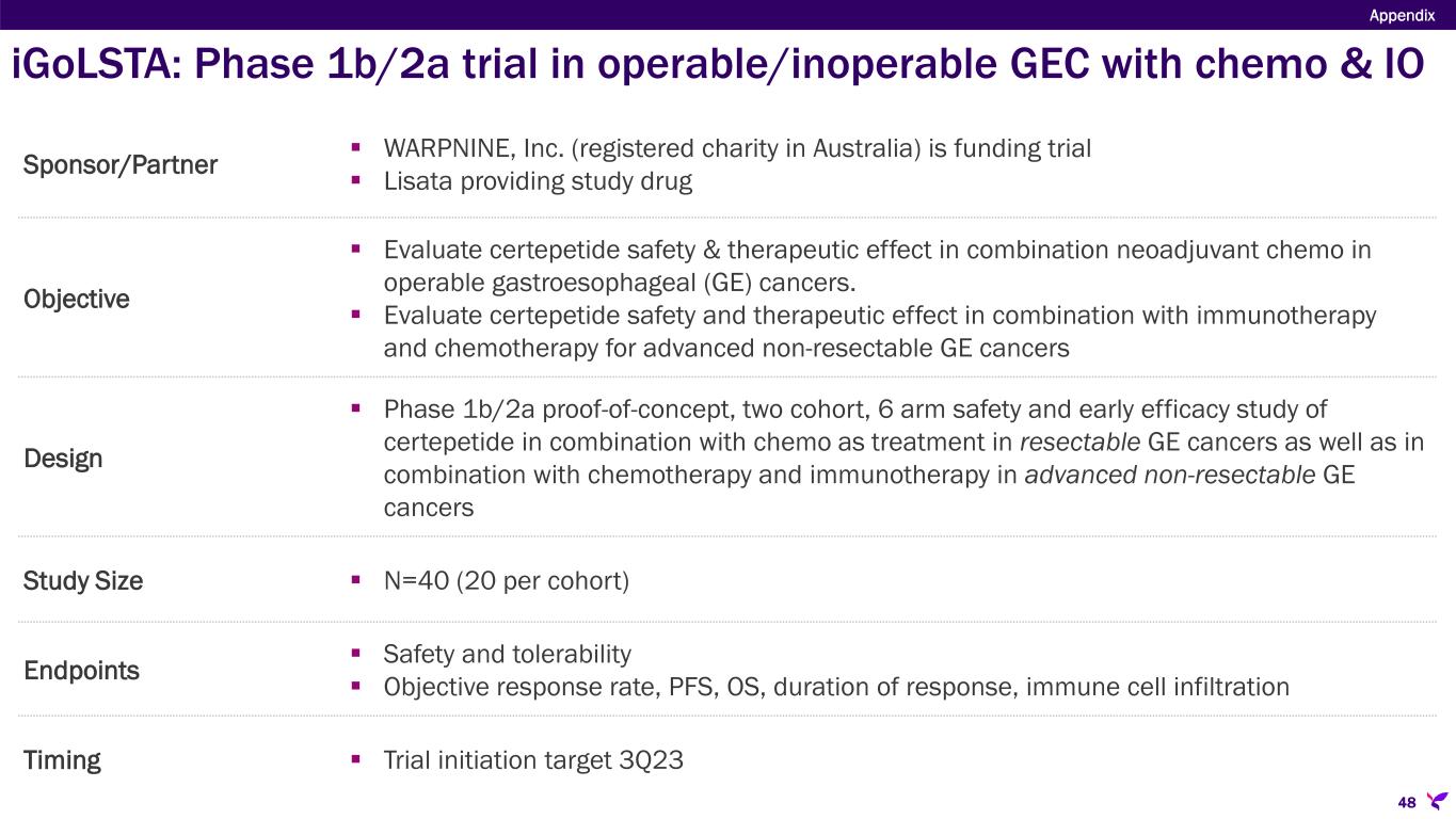 Sponsor/Partner  WARPNINE, Inc. (registered charity in Australia) is funding trial  Lisata providing study drug Objective  Evaluate certepetide safety & therapeutic effect in combination neoadjuvant chemo in operable gastroesophageal (GE) cancers.  Evaluate certepetide safety and therapeutic effect in combination with immunotherapy and chemotherapy for advanced non-resectable GE cancers Design  Phase 1b/2a proof-of-concept, two cohort, 6 arm safety and early efficacy study of certepetide in combination with chemo as treatment in resectable GE cancers as well as in combination with chemotherapy and immunotherapy in advanced non-resectable GE cancers Study Size  N=40 (20 per cohort) Endpoints  Safety and tolerability  Objective response rate, PFS, OS, duration of response, immune cell infiltration Timing  Trial initiation target 3Q23 Appendix 48 iGoLSTA: Phase 1b/2a trial in operable/inoperable GEC with chemo & IO