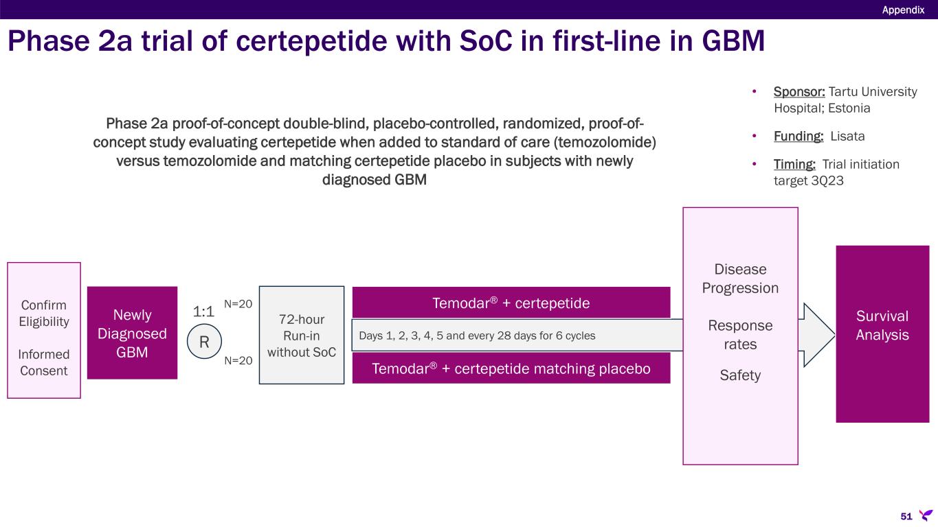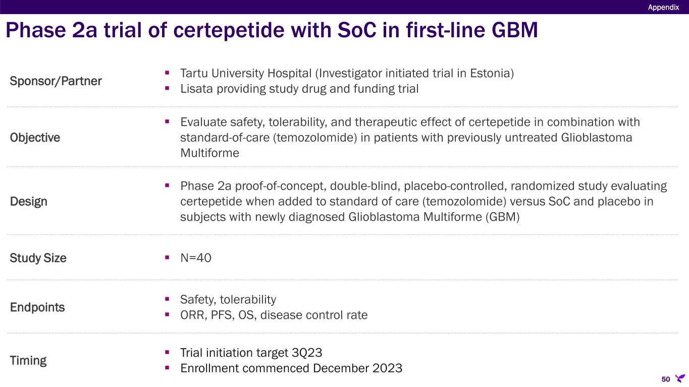 Sponsor/Partner  Tartu University Hospital (Investigator initiated trial in Estonia)  Lisata providing study drug and funding trial Objective  Evaluate safety, tolerability, and therapeutic effect of certepetide in combination with standard-of-care (temozolomide) in patients with previously untreated Glioblastoma Multiforme Design  Phase 2a proof-of-concept, double-blind, placebo-controlled, randomized study evaluating certepetide when added to standard of care (temozolomide) versus SoC and placebo in subjects with newly diagnosed Glioblastoma Multiforme (GBM) Study Size  N=40 Endpoints  Safety, tolerability  ORR, PFS, OS, disease control rate Timing  Trial initiation target 3Q23  Enrollment commenced December 2023 Appendix 50 Phase 2a trial of certepetide with SoC in first-line GBM