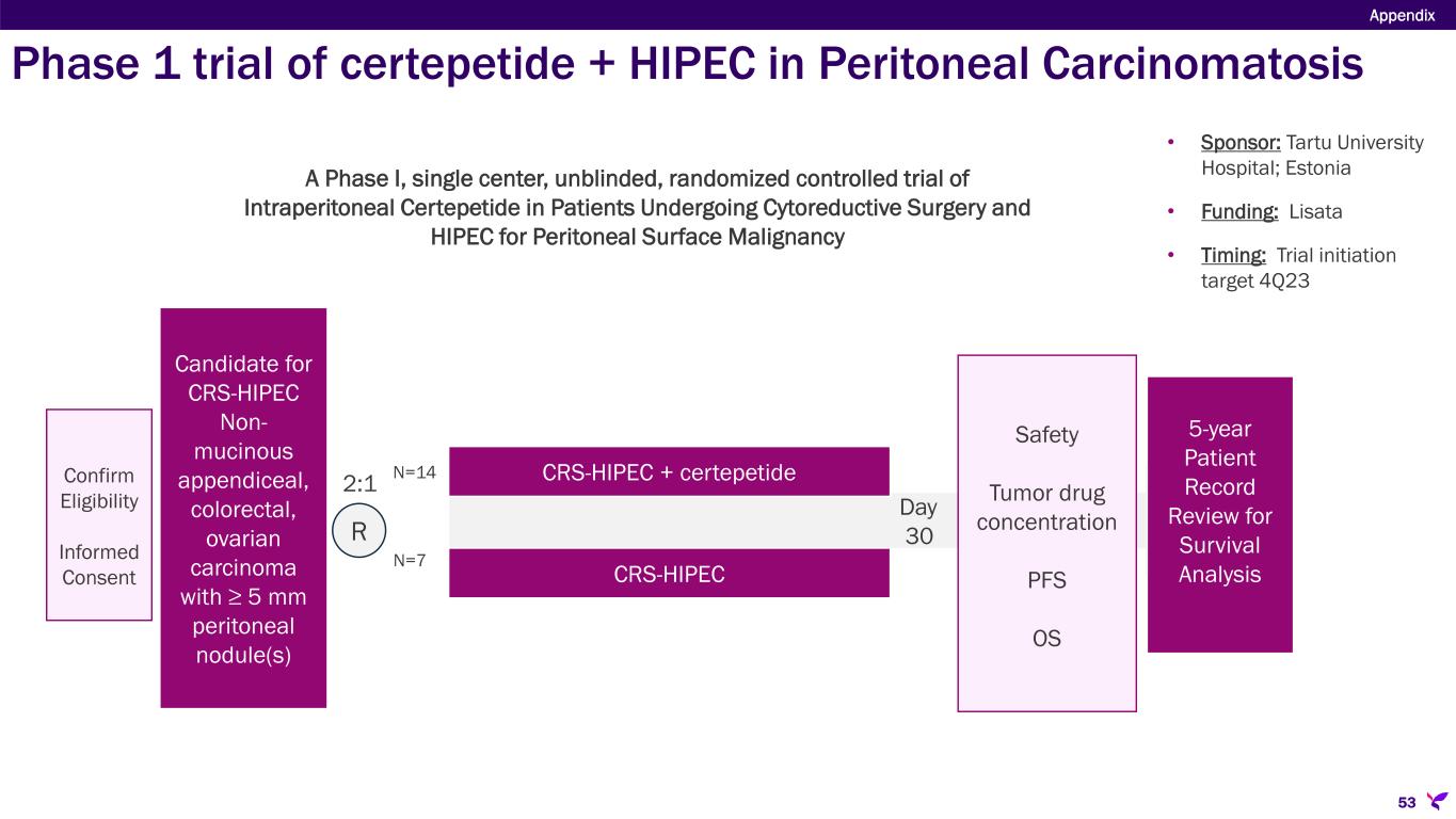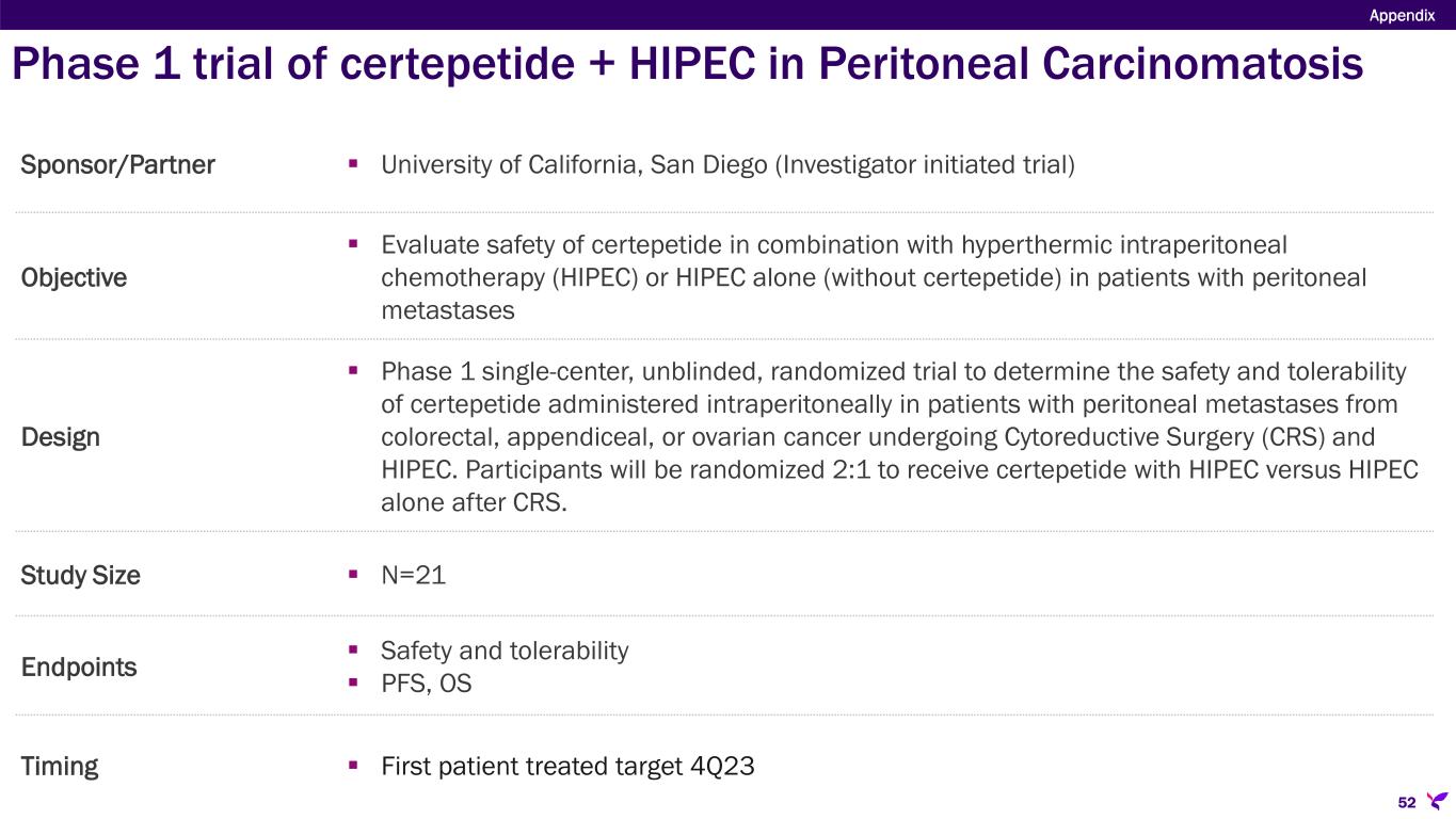 Sponsor/Partner  University of California, San Diego (Investigator initiated trial) Objective  Evaluate safety of certepetide in combination with hyperthermic intraperitoneal chemotherapy (HIPEC) or HIPEC alone (without certepetide) in patients with peritoneal metastases Design  Phase 1 single-center, unblinded, randomized trial to determine the safety and tolerability of certepetide administered intraperitoneally in patients with peritoneal metastases from colorectal, appendiceal, or ovarian cancer undergoing Cytoreductive Surgery (CRS) and HIPEC. Participants will be randomized 2:1 to receive certepetide with HIPEC versus HIPEC alone after CRS. Study Size  N=21 Endpoints  Safety and tolerability  PFS, OS Timing  First patient treated target 4Q23 Appendix 52 Phase 1 trial of certepetide + HIPEC in Peritoneal Carcinomatosis
