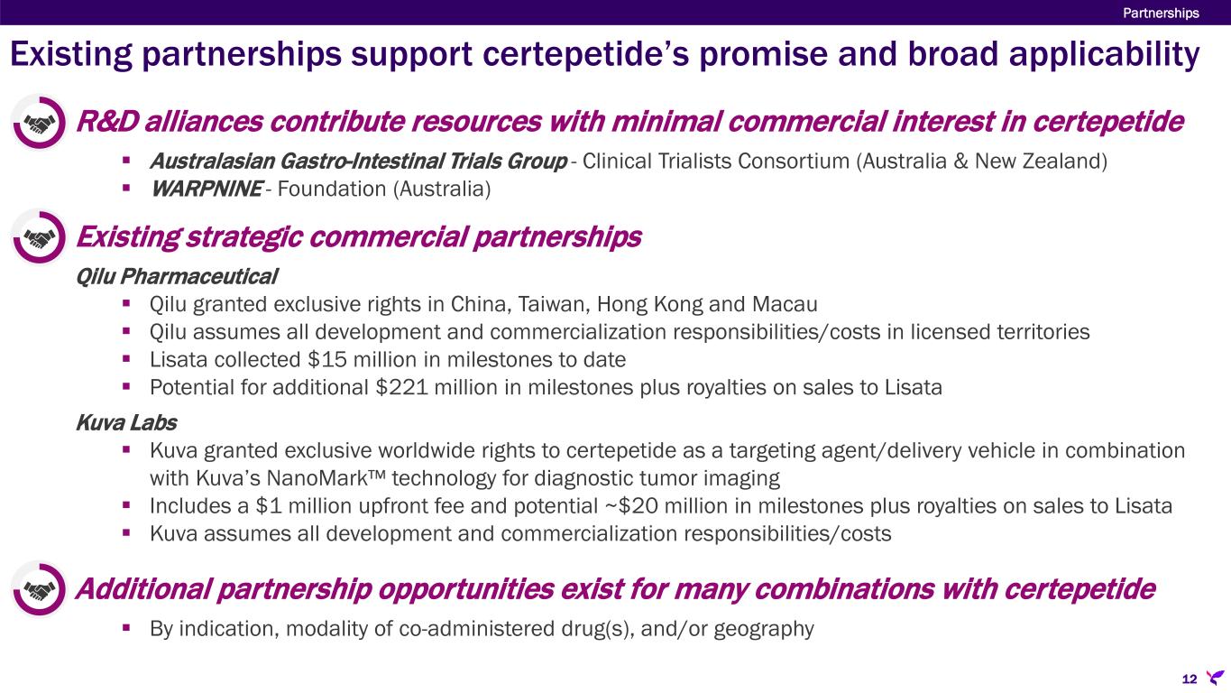 Existing partnerships support certepetide’s promise and broad applicability Partnerships 12 R&D alliances contribute resources with minimal commercial interest in certepetide  Australasian Gastro-Intestinal Trials Group - Clinical Trialists Consortium (Australia & New Zealand)  WARPNINE - Foundation (Australia) Existing strategic commercial partnerships Qilu Pharmaceutical  Qilu granted exclusive rights in China, Taiwan, Hong Kong and Macau  Qilu assumes all development and commercialization responsibilities/costs in licensed territories  Lisata collected $15 million in milestones to date  Potential for additional $221 million in milestones plus royalties on sales to Lisata Kuva Labs  Kuva granted exclusive worldwide rights to certepetide as a targeting agent/delivery vehicle in combination with Kuva’s NanoMark technology for diagnostic tumor imaging  Includes a $1 million upfront fee and potential ~$20 million in milestones plus royalties on sales to Lisata  Kuva assumes all development and commercialization responsibilities/costs Additional partnership opportunities exist for many combinations with certepetide  By indication, modality of co-administered drug(s), and/or geography