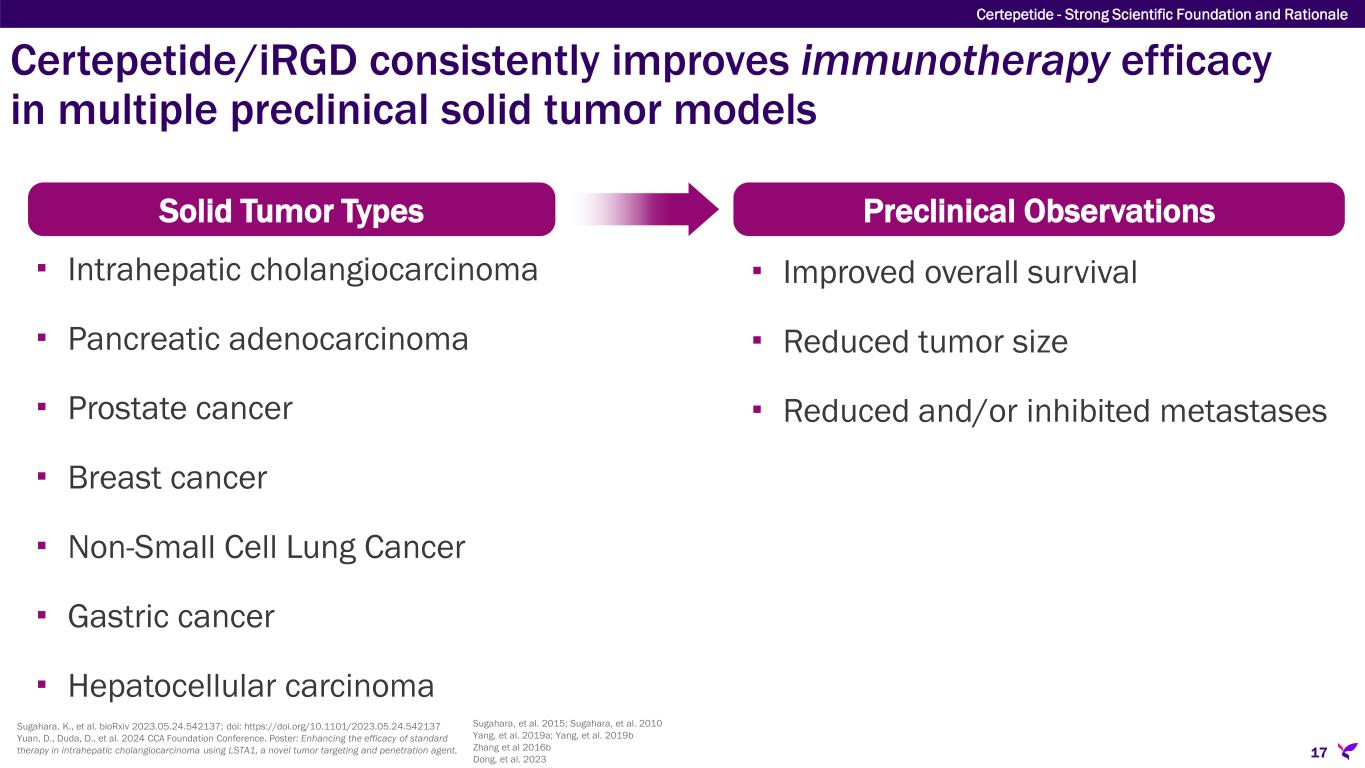Certepetide/iRGD consistently improves immunotherapy efficacy in multiple preclinical solid tumor models Certepetide - Strong Scientific Foundation and Rationale Solid Tumor Types  Intrahepatic cholangiocarcinoma  Pancreatic adenocarcinoma  Prostate cancer  Breast cancer  Non-Small Cell Lung Cancer  Gastric cancer  Hepatocellular carcinoma Preclinical Observations  Improved overall survival  Reduced tumor size  Reduced and/or inhibited metastases Sugahara, K., et al. bioRxiv 2023.05.24.542137; doi: https://doi.org/10.1101/2023.05.24.542137 Yuan, D., Duda, D., et al. 2024 CCA Foundation Conference. Poster: Enhancing the efficacy of standard therapy in intrahepatic cholangiocarcinoma using LSTA1, a novel tumor targeting and penetration agent. Sugahara, et al. 2015; Sugahara, et al. 2010 Yang, et al. 2019a; Yang, et al. 2019b Zhang et al 2016b Dong, et al. 2023 17