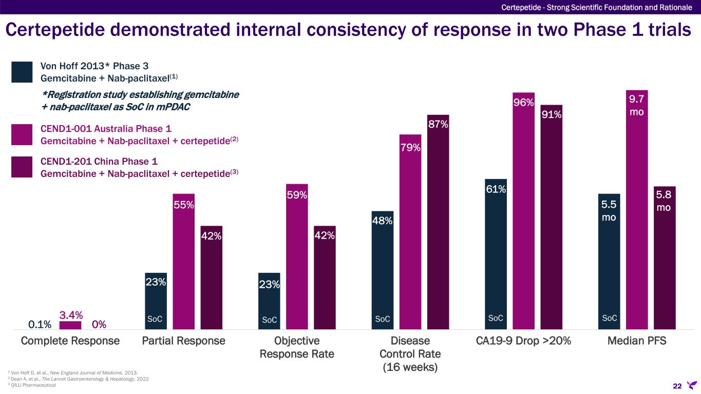 21 Certepetide - Strong Scientific Foundation and Rationale Certepetide improved survival in mPDAC in two independent, multicenter Phase 1 trials 1 Von Hoff D, et al., New England Journal of Medicine, 2013. 2 Dean A, et al., The Lancet Gastroenterology & Hepatology, 2022 3 QILU Pharmaceutical 0.5 2.5 4.5 6.5 8.5 10.5 12.5 Median Overall Survival (Months) M on th s 13.2 months 8.5 months 11.1 months 55% improvement SoC + certepetide 31% improvement SoC CEND1-201 China Phase 1 Gemcitabine + Nab-paclitaxel + certepetide(3) Von Hoff 2013* Phase 3 Gemcitabine + Nab-paclitaxel(1) *Registration study establishing gemcitabine + nab-paclitaxel as SoC in mPDAC CEND1-001 Australia Phase 1 Gemcitabine + Nab-paclitaxel + certepetide(2)