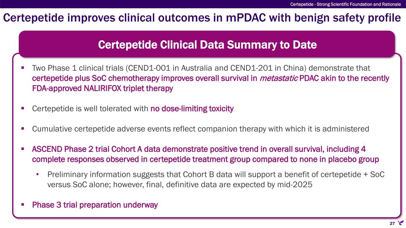 ASCEND: Preliminary Cohort A overall survival data 26 Certepetide - Strong Scientific Foundation and Rationale Cohort A ONE IV PUSH OF CERTEPETIDE + SoC  Cohort A not powered for OS  Data mature - 76% (72 deaths out of 95)  mOS numerically favors certepetide (12.68 vs. 9.72 months); separation occurs at 7 months similar to NAPOLI-3  Cohort A ORR* data favors certepetide  Certepetide – 4 complete responses  Placebo – 0 complete responses Moderately censored – patients still in follow-up Cohort A: Overall Survival (OS) Data Treatment arm Participants Median OS in months (95% CI) Certepetide 66 12.68 (10.18, 16.30) Placebo 29 9.72 (7.10, 16.39) median Certepetide Placebo *ORR: Objective Response Rate