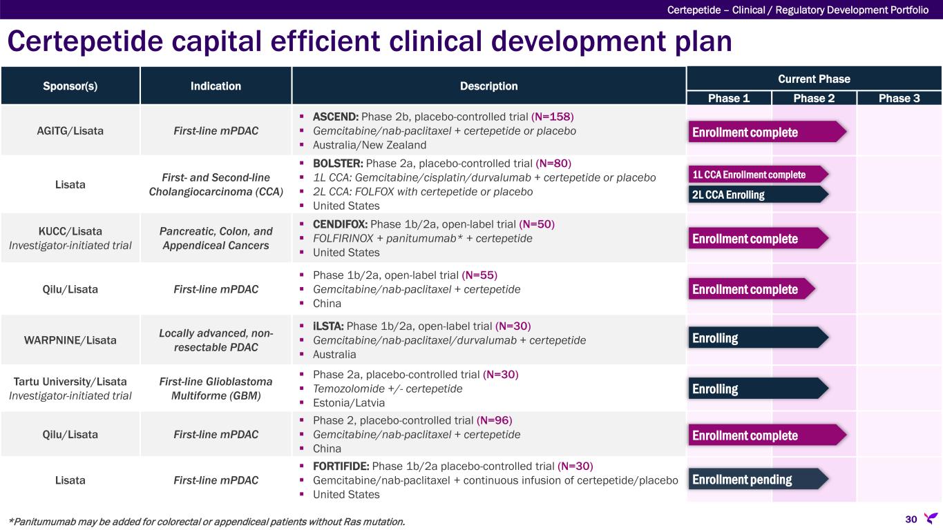 Certepetide – Clinical / Regulatory Development Portfolio Certepetide special regulatory designations and benefits 29 FDA Fast Track Designation • Pancreatic cancer (FDA)  Eligible for Accelerated Approval, Priority Review and Rolling Review  Provides for program-specific guidance from and frequent communication with FDA Orphan Drug Designations • Pancreatic cancer (FDA & EMA) • Malignant glioma (FDA) • Osteosarcoma (FDA) • Cholangiocarcinoma (FDA)  Eligible for tax credits, marketing exclusivity, fee waivers and development grants  Provides for specialized regulatory assistance from FDA's Office of Orphan Products Development FDA Rare Pediatric Disease Designation • Osteosarcoma (FDA)  Eligible for Priority Review Voucher upon approval; redeemable for a priority review for any subsequent marketing application, or may be sold or transferred  Vouchers have sold recently for $75-$100 million and, historically, for up to $350 million *Priority Review Voucher program expires September 2026 and may not be renewed