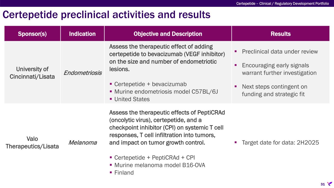 Certepetide preclinical activities and results Sponsor(s) Indication Objective and Description Results University of Cincinnati/Lisata Endometriosis Assess the therapeutic effect of adding certepetide to bevacizumab (VEGF inhibitor) on the size and number of endometriotic lesions.  Certepetide + bevacizumab  Murine endometriosis model C57BL/6J  United States  Preclinical data under review  Encouraging early signals warrant further investigation  Next steps contingent on funding and strategic fit Valo Therapeutics/Lisata Melanoma Assess the therapeutic effects of PeptiCRAd (oncolytic virus), certepetide, and a checkpoint inhibitor (CPI) on systemic T cell responses, T cell infiltration into tumors, and impact on tumor growth control.  Certepetide + PeptiCRAd + CPI  Murine melanoma model B16-OVA  Finland  Target date for data: 2H2025 Certepetide – Clinical / Regulatory Development Portfolio 31