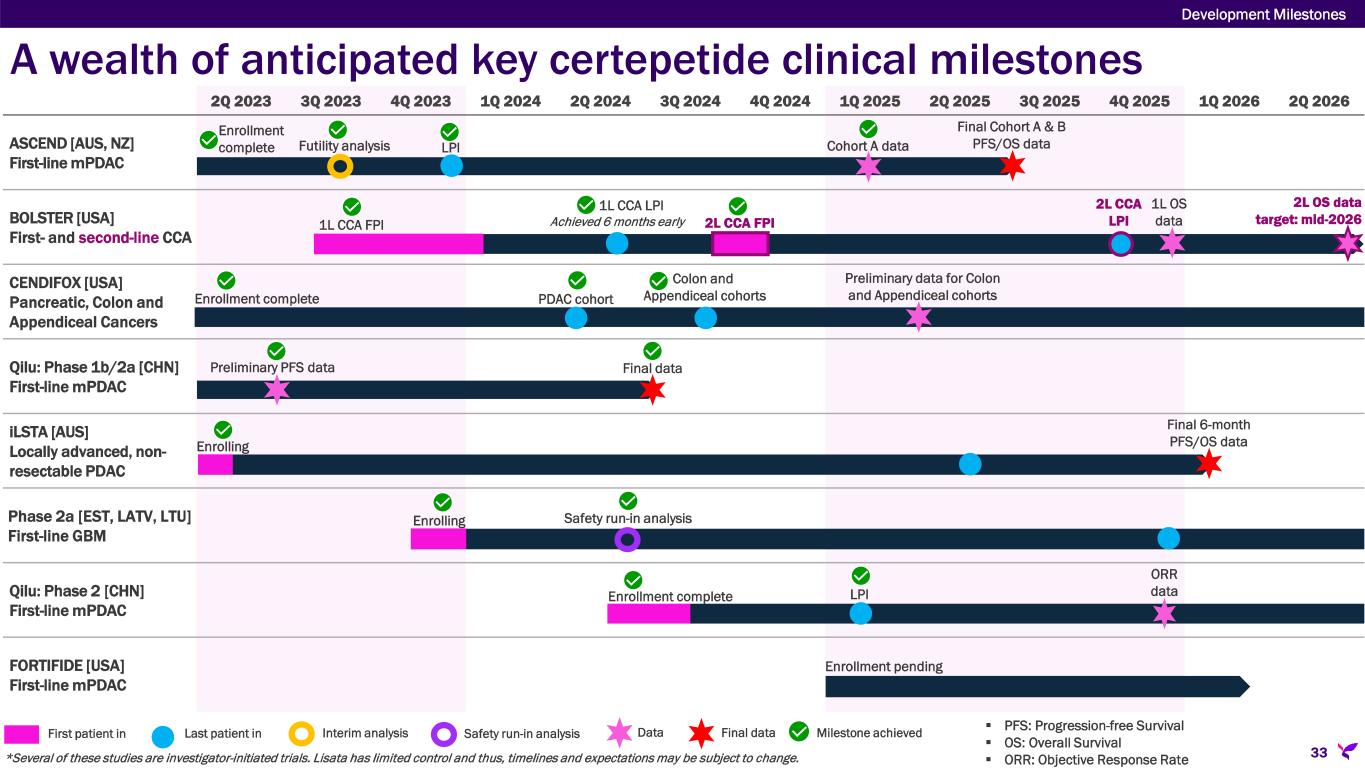Appendix Certepetide capital efficient clinical development plan Development Partner(s) [Development Venue] Indication and Trial Product/Comparator Stage of Development Strategic Rationale Lisata/AGITG [Australia/New Zealand] First-line mPDAC; Gemcitabine/nab-paclitaxel with certepetide or placebo Phase 2b (ASCEND) Corroborate Phase 1b results in a placebo-controlled trial and evaluate 2 dose regimens of certepetide for dose optimization Lisata [United States] First- and Second-line Cholangiocarcinoma (CCA); 1L CCA: Gemcitabine/cisplatin/durvalumab + certepetide or placebo 2L CCA: FOLFOX + certepetide or placebo Phase 2a (BOLSTER) Assess certepetide safety and effectiveness in cholangiocarcinoma in a placebo-controlled trial (proof-of-concept) KUCC/Lisata* [United States] Pancreatic, Colon & Appendiceal Cancers; FOLFIRINOX + panitumumab** with certepetide Phase 1b/2a (CENDIFOX) Tumor immuno-profiling pre- & post- treatment and certepetide effectiveness assessment in combination with chemo and an EGFR inhibitor (open-label) Qilu [China] First-line mPDAC; Gemcitabine/nab-paclitaxel + certepetide Phase 1b/2a Assess safety, PK and therapeutic effect of certepetide in Chinese patients (open-label) WARPNINE/Lisata [Australia] Locally Advanced, Non-Resectable PDAC; Gemcitabine/nab-paclitaxel/durvalumab + certepetide Phase 1b/2a (iLSTA) Assess certepetide safety and effectiveness in combination with IO & Chemo in locally advanced PDAC; determine if inoperable tumors can become operable (open-label) Tartu University/Lisata* [Estonia/Latvia] First-line Glioblastoma Multiforme (GBM); Temozolomide +/- certepetide Phase 2a Assess certepetide safety and effectiveness in additional tumor type (GBM) in a placebo-controlled trial Qilu [China] First-line mPDAC; Gemcitabine/Nab-paclitaxel + certepetide Phase 2b Continue development of certepetide in China (placebo controlled) Lisata [United States] First-line mPDAC; Gemcitabine/nab-paclitaxel + continuous infusion of certepetide or placebo Phase 1b/2a (FORTIFIDE) Evaluate the safety, tolerability, and efficacy of a 4-hour continuous infusion of certepetide in combination with SoC in subjects with mPDAC who have progressed on FOLFIRINOX. Haystack MRD technology to measure ctDNA for early efficacy exploration. *Investigator-initiated trial **Panitumumab may be added for colorectal or appendiceal patients without Ras mutation 39