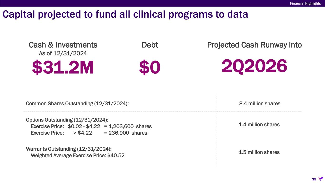 Capital projected to fund all clinical programs to data Financial Highlights 35 $31.2M Cash & Investments As of 12/31/2024 $0 Debt 2Q2026 Projected Cash Runway into Common Shares Outstanding (12/31/2024): 8.4 million shares Options Outstanding (12/31/2024): Exercise Price: $0.02 - $4.22 = 1,203,600 shares Exercise Price: > $4.22 = 236,900 shares 1.4 million shares Warrants Outstanding (12/31/2024): Weighted Average Exercise Price: $40.52 1.5 million shares