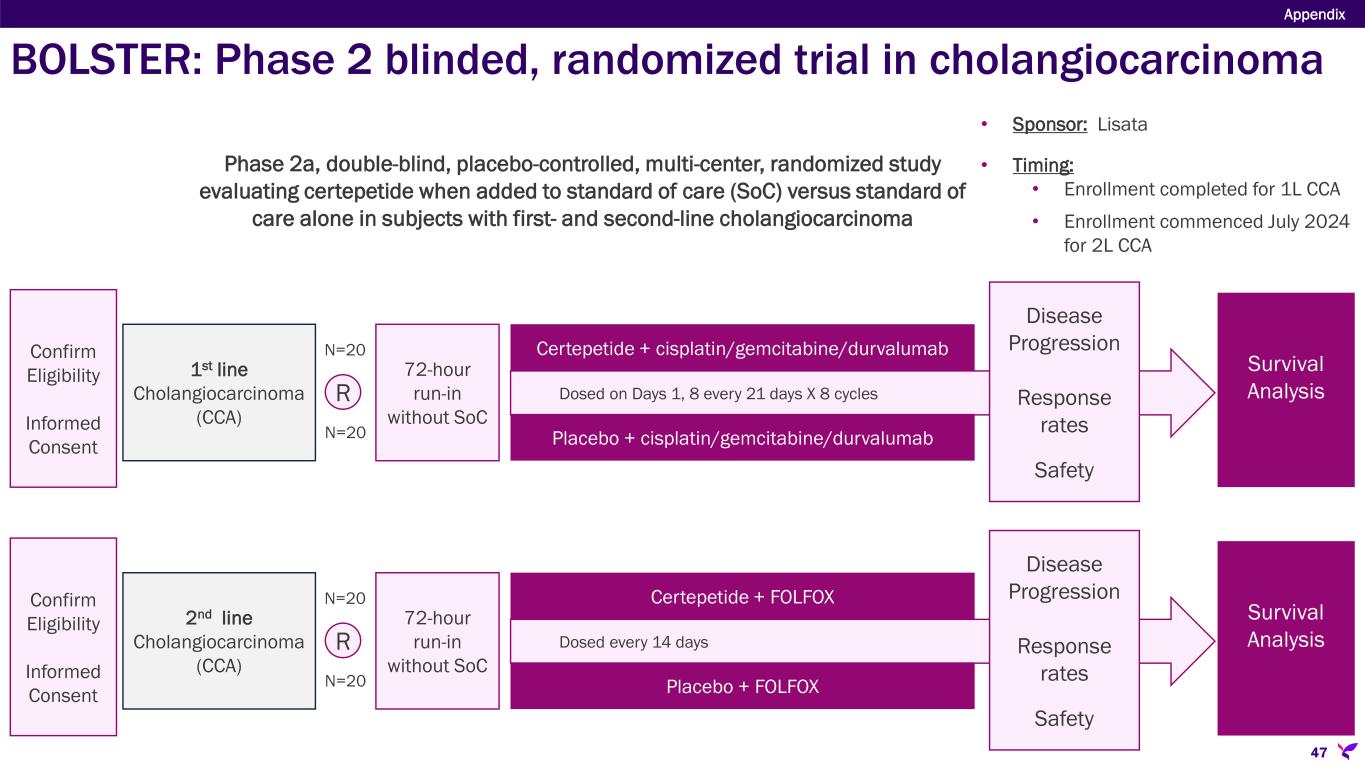 Sponsor/Partner  Lisata (U.S.) Objective  Evaluate the preliminary efficacy, safety and tolerability of certepetide in combination with standards of care in subjects with first- and second-line cholangiocarcinoma Design  Phase 2 randomized, double-blind, placebo-controlled, proof-of-concept trial in first- and second-line cholangiocarcinoma testing corresponding SoC with certepetide or placebo Study Size  N=80 (N=40 per tumor type)  1:1 SoC + certepetide or SoC + placebo Endpoints  Primary: OS  Secondary: Safety, ORR, PFS Timing  Enrollment completed for 1L CCA  Enrollment commenced July 2024 for 2L CCA BOLSTER: Phase 2 blinded, randomized trial in cholangiocarcinoma Appendix 46