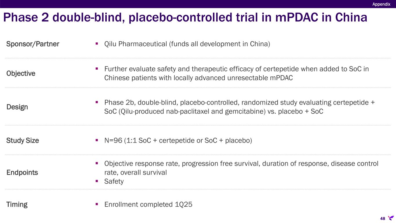 Sponsor/Partner  Qilu Pharmaceutical (funds all development in China) Objective  Further evaluate safety and therapeutic efficacy of certepetide when added to SoC in Chinese patients with locally advanced unresectable mPDAC Design  Phase 2b, double-blind, placebo-controlled, randomized study evaluating certepetide + SoC (Qilu-produced nab-paclitaxel and gemcitabine) vs. placebo + SoC Study Size  N=96 (1:1 SoC + certepetide or SoC + placebo) Endpoints  Objective response rate, progression free survival, duration of response, disease control rate, overall survival  Safety Timing  Enrollment completed 1Q25 Appendix 48 Phase 2 double-blind, placebo-controlled trial in mPDAC in China