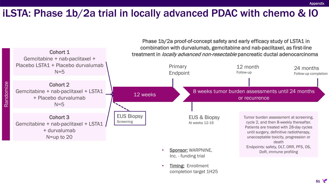 Sponsor/Partner  WARPNINE, Inc. (registered charity in Australia) is funding trial  Lisata providing study drug Objective  Evaluate safety and therapeutic effect of LSTA1 in combination with IO & Chemo in locally advanced non-resectable pancreatic ductal adenocarcinoma (PDAC); determine if inoperable tumors can become operable Design  Phase 1b/2a proof-of-concept safety and early efficacy study of LSTA1 in combination with durvalumab, gemcitabine and nab-paclitaxel, as first-line treatment in locally advanced non-resectable pancreatic adenocarcinoma Study Size  N=30 Endpoints  Safety and tolerability; 28-day DLTs  Objective response rate, PFS, OS, duration of response, immune cell infiltration Timing  Enrollment completion target 1H25 Appendix 50 iLSTA: Phase 1b/2a trial in locally advanced PDAC with chemo & IO