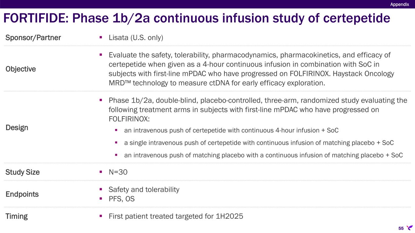 Appendix 55 FORTIFIDE: Phase 1b/2a continuous infusion study of certepetide Sponsor/Partner  Lisata (U.S. only) Objective  Evaluate the safety, tolerability, pharmacodynamics, pharmacokinetics, and efficacy of certepetide when given as a 4-hour continuous infusion in combination with SoC in subjects with first-line mPDAC who have progressed on FOLFIRINOX. Haystack Oncology MRD technology to measure ctDNA for early efficacy exploration. Design  Phase 1b/2a, double-blind, placebo-controlled, three-arm, randomized study evaluating the following treatment arms in subjects with first-line mPDAC who have progressed on FOLFIRINOX:  an intravenous push of certepetide with continuous 4-hour infusion + SoC  a single intravenous push of certepetide with continuous infusion of matching placebo + SoC  an intravenous push of matching placebo with a continuous infusion of matching placebo + SoC Study Size  N=30 Endpoints  Safety and tolerability  PFS, OS Timing  First patient treated targeted for 1H2025