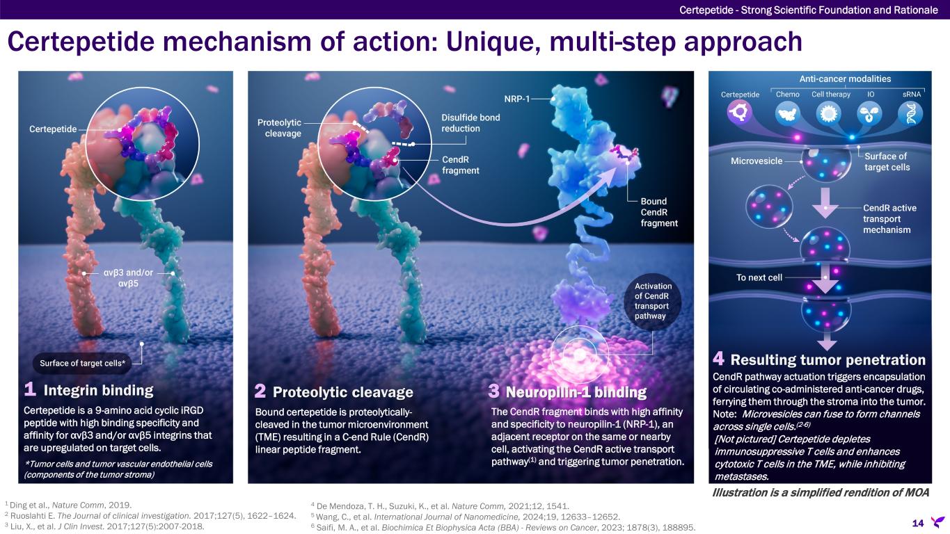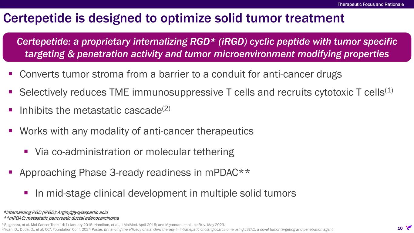 Certepetide/iRGD consistently improves immunotherapy efficacy in multiple preclinical solid tumor models 17 Solid Tumor Types  Intrahepatic cholangiocarcinoma  Pancreatic adenocarcinoma  Prostate cancer  Breast cancer  Non-Small Cell Lung Cancer  Gastric cancer  Hepatocellular carcinoma Preclinical Observations  Improved overall survival  Reduced tumor size  Reduced and/or inhibited metastases Certepetide - Strong Scientific Foundation Sugahara, K., et al. bioRxiv 2023.05.24.542137; doi: https://doi.org/10.1101/2023.05.24.542137 Yuan, D., Duda, D., et al. 2024 CCA Foundation Conference. Poster: Enhancing the efficacy of standard therapy in intrahepatic cholangiocarcinoma using LSTA1, a novel tumor targeting and penetration agent. Sugahara, et al. 2015; Sugahara, et al. 2010 Yang, et al. 2019a; Yang, et al. 2019b Zhang et al 2016b Dong, et al. 2023 AACR 2025 Abstracts: • Kim, M., Sugahara, K., et al. iRGD peptide therapy transforms immunosuppressive microenvironment to immune-favorable state in pancreatic ductal adenocarcinoma (https://www.abstractsonline.com/pp8/#!/20273/presentation/5422). • Miyamura, N., Sugahara, K., et al. A cytotoxic peptide designed for tumor-targeted delivery of co-injected molecules (https://www.abstractsonline.com/pp8/#!/20273/presentation/3881). • Kuroda, Y., Sugahara, K., et al. The iRGD tumor-penetrating peptide inhibits TGF-β activation mediated by an αvβ5 integrin-rich tumor microenvironment in pancreatic cancer (https://www.abstractsonline.com/pp8/#!/20273/presentation/5404). • Choi, Y., Sugahara, K., et al. Altered collagen morphology in pancreatic cancer treated with the iRGD tumor-penetrating peptide (https://www.abstractsonline.com/pp8/#!/20273/presentation/5419).
