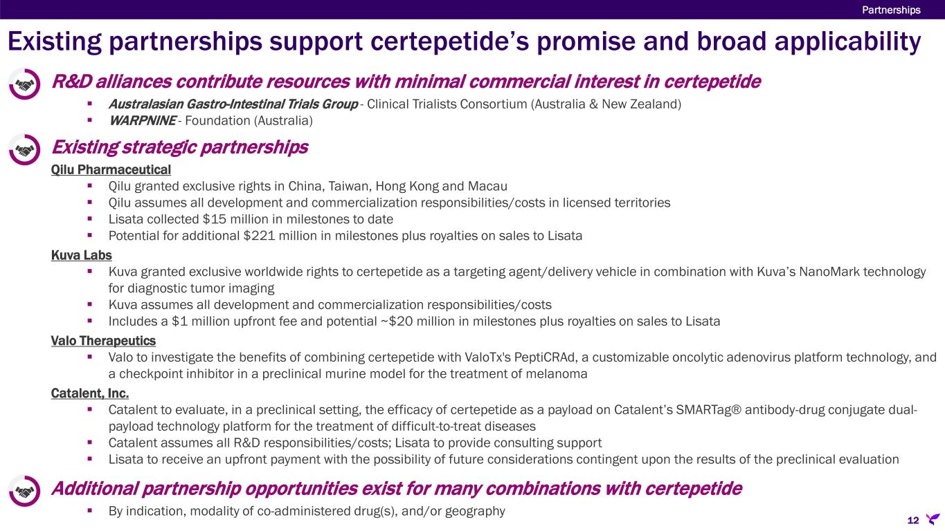 Existing partnerships support certepetide’s promise and broad applicability Partnerships 12 R&D alliances contribute resources with minimal commercial interest in certepetide  Australasian Gastro-Intestinal Trials Group - Clinical Trialists Consortium (Australia & New Zealand)  WARPNINE - Foundation (Australia) Existing strategic partnerships Qilu Pharmaceutical  Qilu granted exclusive rights in China, Taiwan, Hong Kong and Macau  Qilu assumes all development and commercialization responsibilities/costs in licensed territories  Lisata collected $15 million in milestones to date  Potential for additional $221 million in milestones plus royalties on sales to Lisata Kuva Labs  Kuva granted exclusive worldwide rights to certepetide as a targeting agent/delivery vehicle in combination with Kuva’s NanoMark technology for diagnostic tumor imaging  Kuva assumes all development and commercialization responsibilities/costs  Includes a $1 million upfront fee and potential ~$20 million in milestones plus royalties on sales to Lisata Valo Therapeutics  Valo to investigate the benefits of combining certepetide with ValoTx's PeptiCRAd, a customizable oncolytic adenovirus platform technology, and a checkpoint inhibitor in a preclinical murine model for the treatment of melanoma Catalent, Inc.  Catalent to evaluate, in a preclinical setting, the efficacy of certepetide as a payload on Catalent’s SMARTag® antibody-drug conjugate dual- payload technology platform for the treatment of difficult-to-treat diseases  Catalent assumes all R&D responsibilities/costs; Lisata to provide consulting support  Lisata to receive an upfront payment with the possibility of future considerations contingent upon the results of the preclinical evaluation Additional partnership opportunities exist for many combinations with certepetide  By indication, modality of co-administered drug(s), and/or geography