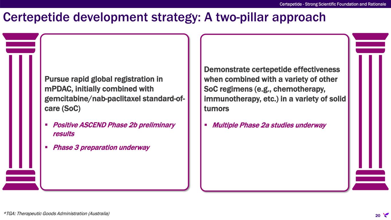 ASCEND: Phase 2b, blinded, randomized trial in mPDAC Appendix R INTERVENTION Arm (N=60) • Nab-paclitaxel 125 mg/m2 IV • Certepetide 3.2 mg/kg IV • Gemcitabine 1000 mg/m2 IV Dose on days 1, 8, 15 every 28 days CONTROL Arm (N=30) • Nab-paclitaxel 125 mg/m2 IV • Matching certepetide Placebo IV • Gemcitabine 1000 mg/m2 IV Dose on days 1, 8, 15 every 28 days INTERVENTION Arm (N=40) • Nab-paclitaxel 125 mg/m2 IV • Certepetide 3.2 mg/kg IV • Gemcitabine 1000 mg/m2 IV • Certepetide 3.2 mg/kg IV 4 hours later Dose on days 1, 8, 15 every 28 days INTERVENTION Arm (N=20) • Nab-paclitaxel 125 mg/m2 IV • Matching certepetide Placebo IV • Gemcitabine 1000 mg/m2 IV • Matching Placebo certepetide IV 4 hours later Dose on days 1, 8, 15 every 28 days R R Cohort A Cohort B 1:1 2:1 2:1 One dose of certepetide assessed Two doses of certepetide assessed Endpoints • Progression Free Survival (PFS) • ORR • OS • Safety • QoL • Exploratory Endpoints • Sponsor/Partner: AGITG in collaboration with the NHMRC Clinical Trial Centre at the University of Sydney • LSTA funded • Timing: Enrollment completed December 2023; Cohort A data released 1Q25 with Cohort B expected in 2Q25Phase 2b randomized, double- blind study in mPDAC testing gemcitabine + nab-paclitaxel (SoC) with two certepetide dose regimens or placebo 41