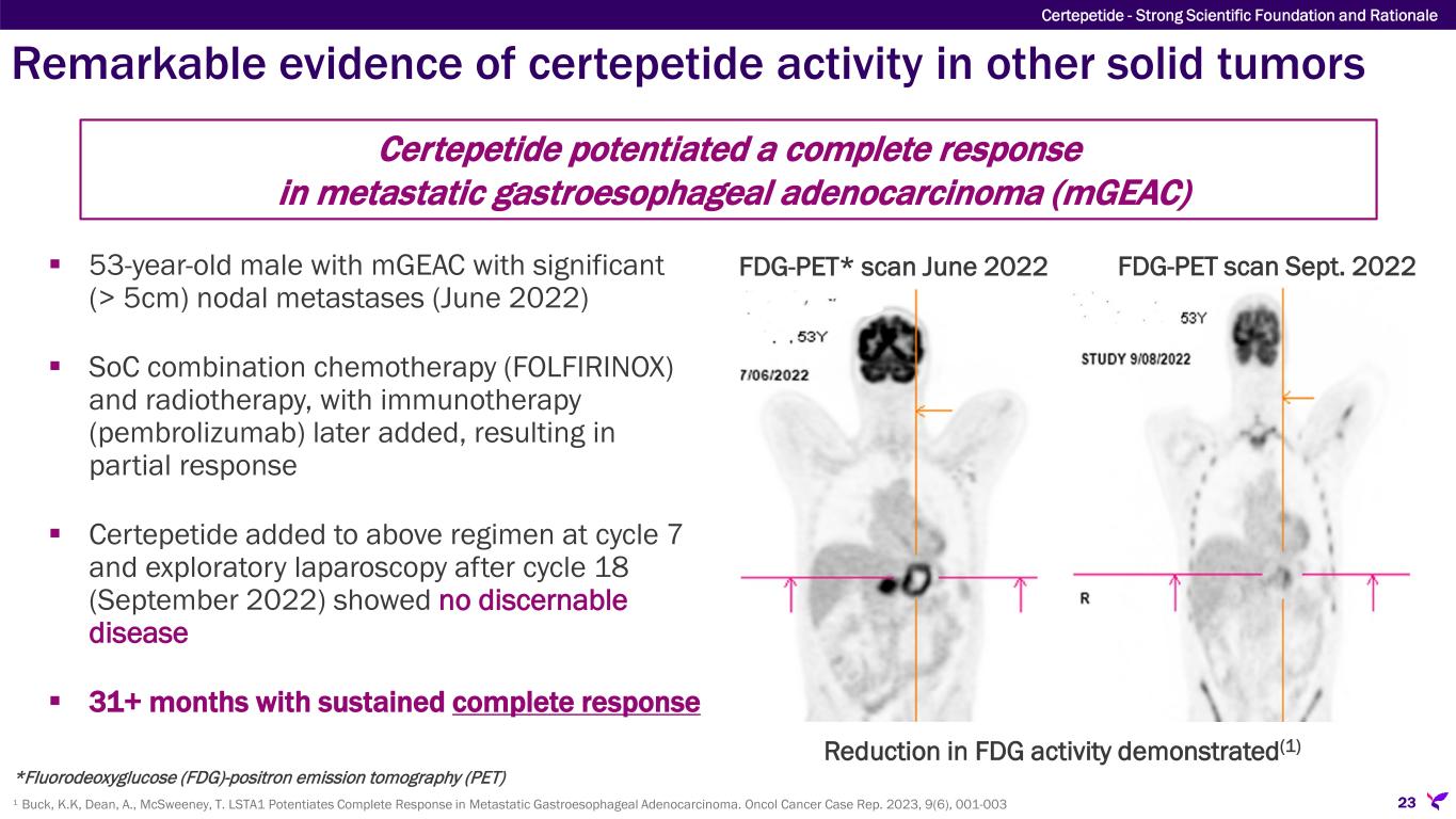 Remarkable evidence of certepetide activity in other solid tumors Certepetide potentiated a complete response in metastatic gastroesophageal adenocarcinoma (mGEAC) FDG-PET* scan June 2022 FDG-PET scan Sept. 2022 Reduction in FDG activity demonstrated(1)  53-year-old male with mGEAC with significant (> 5cm) nodal metastases (June 2022)  SoC combination chemotherapy (FOLFIRINOX) and radiotherapy, with immunotherapy (pembrolizumab) later added, resulting in partial response  Certepetide added to above regimen at cycle 7 and exploratory laparoscopy after cycle 18 (September 2022) showed no discernable disease  31+ months with sustained complete response 231 Buck, K.K, Dean, A., McSweeney, T. LSTA1 Potentiates Complete Response in Metastatic Gastroesophageal Adenocarcinoma. Oncol Cancer Case Rep. 2023, 9(6), 001-003 Certepetide - Strong Scientific Foundation and Rationale *Fluorodeoxyglucose (FDG)-positron emission tomography (PET)