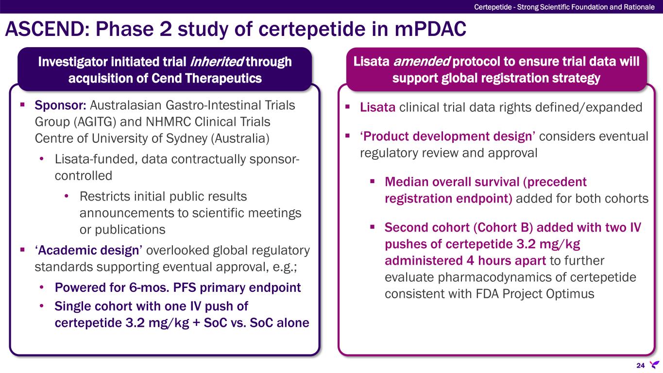 ASCEND: Phase 2 study of certepetide in mPDAC  Sponsor: Australasian Gastro-Intestinal Trials Group (AGITG) and NHMRC Clinical Trials Centre of University of Sydney (Australia) • Lisata-funded, data contractually sponsor- controlled • Restricts initial public results announcements to scientific meetings or publications  ‘Academic design’ overlooked global regulatory standards supporting eventual approval, e.g.; • Powered for 6-mos. PFS primary endpoint • Single cohort with one IV push of certepetide 3.2 mg/kg + SoC vs. SoC alone Investigator initiated trial inherited through acquisition of Cend Therapeutics Lisata amended protocol to ensure trial data will support global registration strategy  Lisata clinical trial data rights defined/expanded  ‘Product development design’ considers eventual regulatory review and approval  Median overall survival (precedent registration endpoint) added for both cohorts  Second cohort (Cohort B) added with two IV pushes of certepetide 3.2 mg/kg administered 4 hours apart to further evaluate pharmacodynamics of certepetide consistent with FDA Project Optimus 24 Certepetide - Strong Scientific Foundation and Rationale