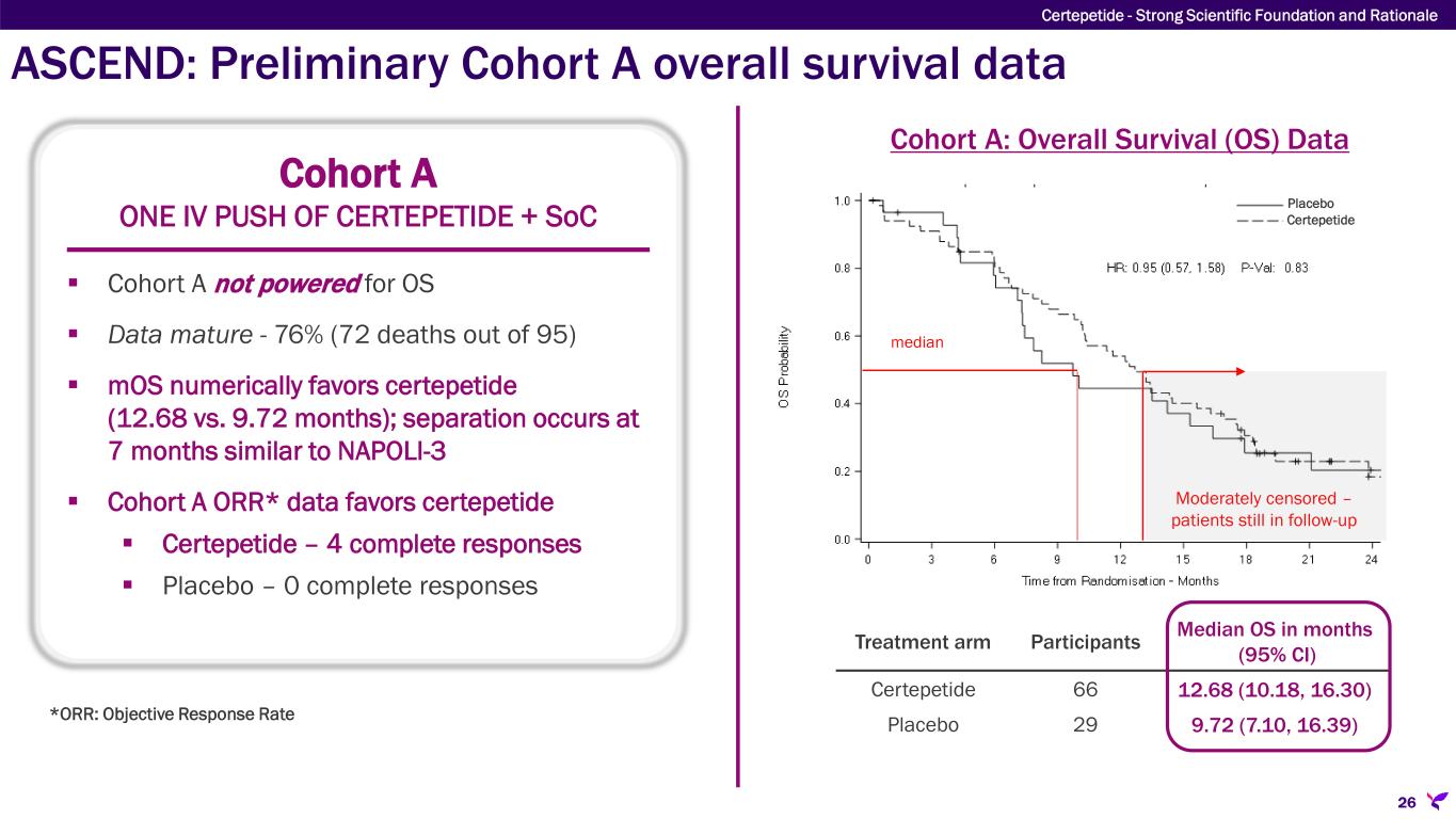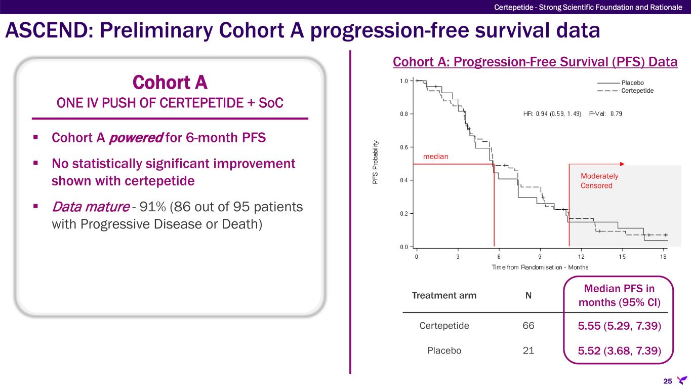 ASCEND: Preliminary Cohort A progression-free survival data Cohort A ONE IV PUSH OF CERTEPETIDE + SoC  Cohort A powered for 6-month PFS  No statistically significant improvement shown with certepetide  Data mature - 91% (86 out of 95 patients with Progressive Disease or Death) Cohort A: Progression-Free Survival (PFS) Data Treatment arm N Median PFS in months (95% CI) Certepetide 66 5.55 (5.29, 7.39) Placebo 21 5.52 (3.68, 7.39) median Moderately Censored Certepetide Placebo 25 Certepetide - Strong Scientific Foundation and Rationale