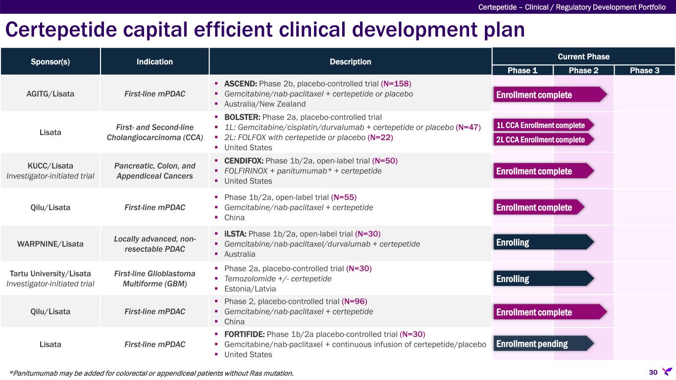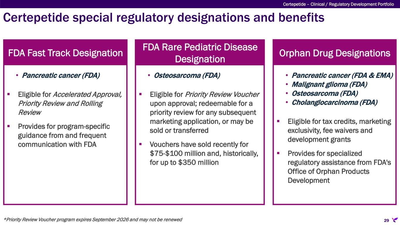 Certepetide – Clinical / Regulatory Development Portfolio Certepetide special regulatory designations and benefits 29 FDA Fast Track Designation • Pancreatic cancer (FDA)  Eligible for Accelerated Approval, Priority Review and Rolling Review  Provides for program-specific guidance from and frequent communication with FDA Orphan Drug Designations • Pancreatic cancer (FDA & EMA) • Malignant glioma (FDA) • Osteosarcoma (FDA) • Cholangiocarcinoma (FDA)  Eligible for tax credits, marketing exclusivity, fee waivers and development grants  Provides for specialized regulatory assistance from FDA's Office of Orphan Products Development FDA Rare Pediatric Disease Designation • Osteosarcoma (FDA)  Eligible for Priority Review Voucher upon approval; redeemable for a priority review for any subsequent marketing application, or may be sold or transferred  Vouchers have sold recently for $75-$100 million and, historically, for up to $350 million *Priority Review Voucher program expires September 2026 and may not be renewed