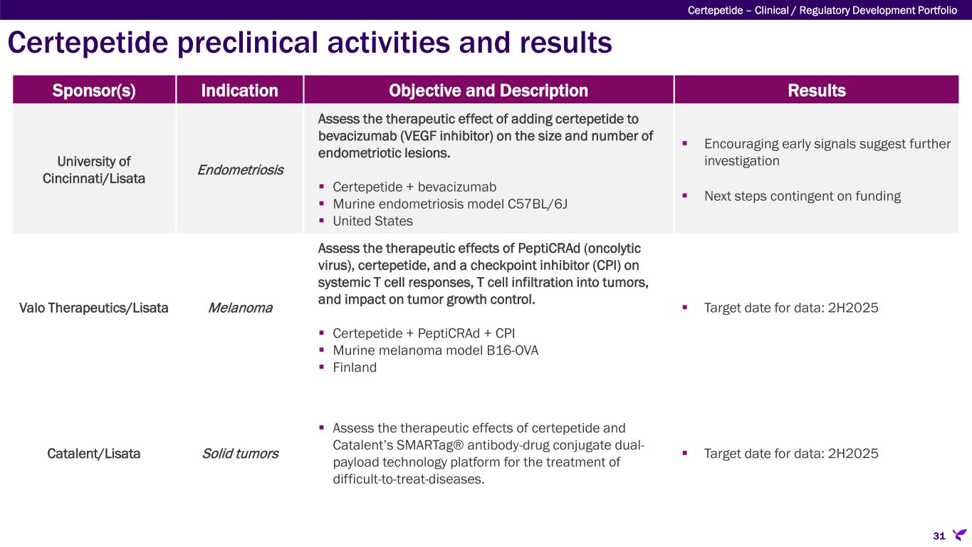 Certepetide preclinical activities and results Sponsor(s) Indication Objective and Description Results University of Cincinnati/Lisata Endometriosis Assess the therapeutic effect of adding certepetide to bevacizumab (VEGF inhibitor) on the size and number of endometriotic lesions.  Certepetide + bevacizumab  Murine endometriosis model C57BL/6J  United States  Encouraging early signals suggest further investigation  Next steps contingent on funding Valo Therapeutics/Lisata Melanoma Assess the therapeutic effects of PeptiCRAd (oncolytic virus), certepetide, and a checkpoint inhibitor (CPI) on systemic T cell responses, T cell infiltration into tumors, and impact on tumor growth control.  Certepetide + PeptiCRAd + CPI  Murine melanoma model B16-OVA  Finland  Target date for data: 2H2025 Catalent/Lisata Solid tumors  Assess the therapeutic effects of certepetide and Catalent’s SMARTag® antibody-drug conjugate dual- payload technology platform for the treatment of difficult-to-treat-diseases.  Target date for data: 2H2025 Certepetide – Clinical / Regulatory Development Portfolio 31