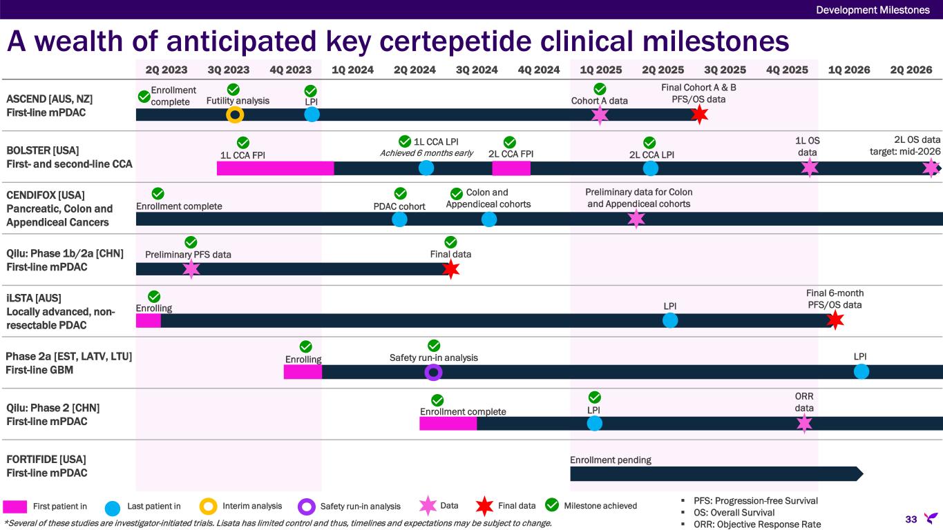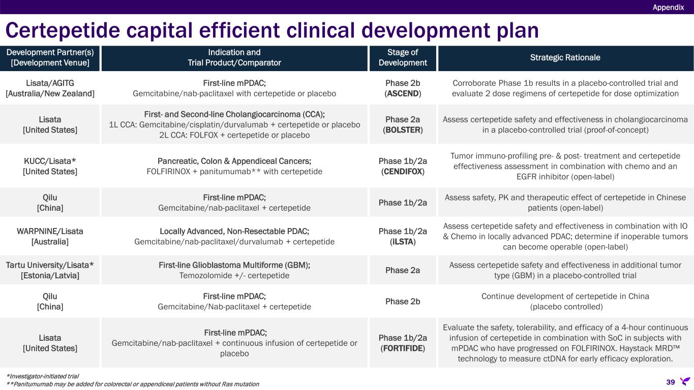 Appendix Certepetide capital efficient clinical development plan Development Partner(s) [Development Venue] Indication and Trial Product/Comparator Stage of Development Strategic Rationale Lisata/AGITG [Australia/New Zealand] First-line mPDAC; Gemcitabine/nab-paclitaxel with certepetide or placebo Phase 2b (ASCEND) Corroborate Phase 1b results in a placebo-controlled trial and evaluate 2 dose regimens of certepetide for dose optimization Lisata [United States] First- and Second-line Cholangiocarcinoma (CCA); 1L CCA: Gemcitabine/cisplatin/durvalumab + certepetide or placebo 2L CCA: FOLFOX + certepetide or placebo Phase 2a (BOLSTER) Assess certepetide safety and effectiveness in cholangiocarcinoma in a placebo-controlled trial (proof-of-concept) KUCC/Lisata* [United States] Pancreatic, Colon & Appendiceal Cancers; FOLFIRINOX + panitumumab** with certepetide Phase 1b/2a (CENDIFOX) Tumor immuno-profiling pre- & post- treatment and certepetide effectiveness assessment in combination with chemo and an EGFR inhibitor (open-label) Qilu [China] First-line mPDAC; Gemcitabine/nab-paclitaxel + certepetide Phase 1b/2a Assess safety, PK and therapeutic effect of certepetide in Chinese patients (open-label) WARPNINE/Lisata [Australia] Locally Advanced, Non-Resectable PDAC; Gemcitabine/nab-paclitaxel/durvalumab + certepetide Phase 1b/2a (iLSTA) Assess certepetide safety and effectiveness in combination with IO & Chemo in locally advanced PDAC; determine if inoperable tumors can become operable (open-label) Tartu University/Lisata* [Estonia/Latvia] First-line Glioblastoma Multiforme (GBM); Temozolomide +/- certepetide Phase 2a Assess certepetide safety and effectiveness in additional tumor type (GBM) in a placebo-controlled trial Qilu [China] First-line mPDAC; Gemcitabine/Nab-paclitaxel + certepetide Phase 2b Continue development of certepetide in China (placebo controlled) Lisata [United States] First-line mPDAC; Gemcitabine/nab-paclitaxel + continuous infusion of certepetide or placebo Phase 1b/2a (FORTIFIDE) Evaluate the safety, tolerability, and efficacy of a 4-hour continuous infusion of certepetide in combination with SoC in subjects with mPDAC who have progressed on FOLFIRINOX. Haystack MRD technology to measure ctDNA for early efficacy exploration. *Investigator-initiated trial **Panitumumab may be added for colorectal or appendiceal patients without Ras mutation 39