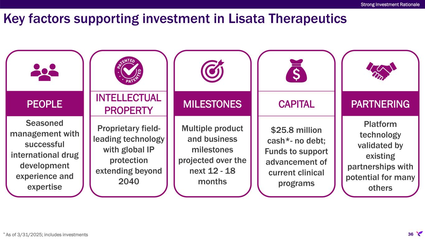 © L i s a t a T h e r a p e u t i c s , I n c . 2 0 2 5 . A l l r i g h t s r e s e r v e d . Investor Relations Contact: John D. Menditto VP, IR & Corporate Communications Tel: (908) 842-0084 | Email: jmenditto@lisata.com Nasdaq: LSTA | www.lisata.com Targeted Therapy Delivered