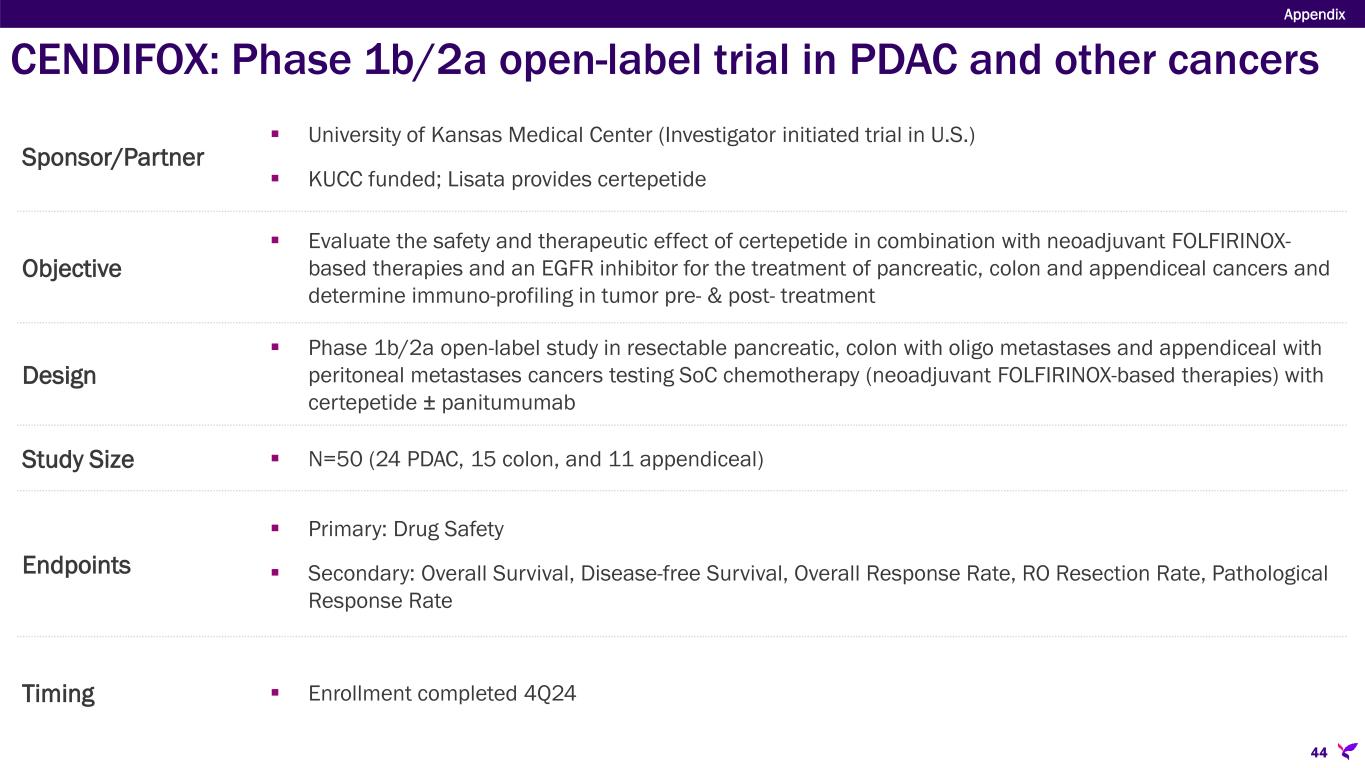 Sponsor/Partner  University of Kansas Medical Center (Investigator initiated trial in U.S.)  KUCC funded; Lisata provides certepetide Objective  Evaluate the safety and therapeutic effect of certepetide in combination with neoadjuvant FOLFIRINOX- based therapies and an EGFR inhibitor for the treatment of pancreatic, colon and appendiceal cancers and determine immuno-profiling in tumor pre- & post- treatment Design  Phase 1b/2a open-label study in resectable pancreatic, colon with oligo metastases and appendiceal with peritoneal metastases cancers testing SoC chemotherapy (neoadjuvant FOLFIRINOX-based therapies) with certepetide ± panitumumab Study Size  N=50 (24 PDAC, 15 colon, and 11 appendiceal) Endpoints  Primary: Drug Safety  Secondary: Overall Survival, Disease-free Survival, Overall Response Rate, RO Resection Rate, Pathological Response Rate Timing  Enrollment completed 4Q24 CENDIFOX: Phase 1b/2a open-label trial in PDAC and other cancers Appendix 44