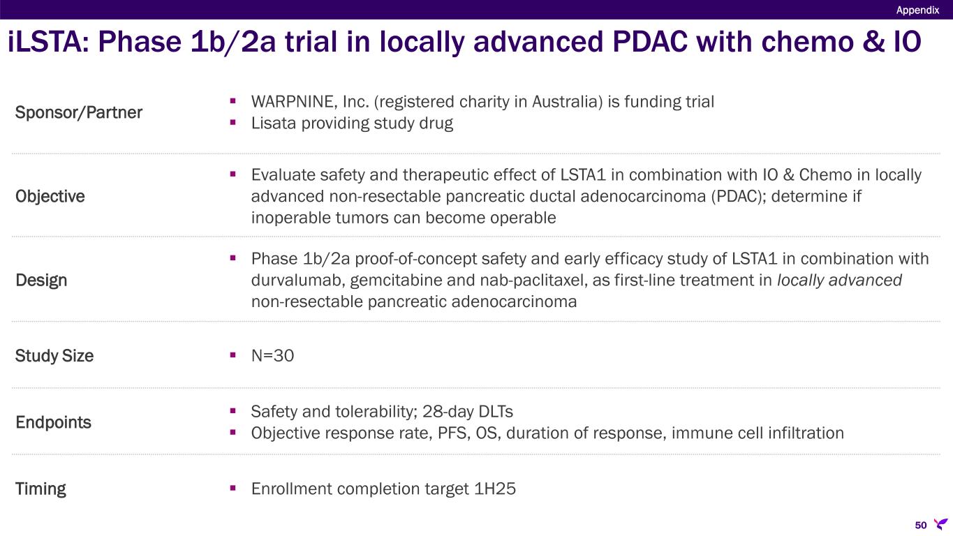 Sponsor/Partner  WARPNINE, Inc. (registered charity in Australia) is funding trial  Lisata providing study drug Objective  Evaluate safety and therapeutic effect of LSTA1 in combination with IO & Chemo in locally advanced non-resectable pancreatic ductal adenocarcinoma (PDAC); determine if inoperable tumors can become operable Design  Phase 1b/2a proof-of-concept safety and early efficacy study of LSTA1 in combination with durvalumab, gemcitabine and nab-paclitaxel, as first-line treatment in locally advanced non-resectable pancreatic adenocarcinoma Study Size  N=30 Endpoints  Safety and tolerability; 28-day DLTs  Objective response rate, PFS, OS, duration of response, immune cell infiltration Timing  Enrollment completion target 1H25 Appendix 50 iLSTA: Phase 1b/2a trial in locally advanced PDAC with chemo & IO