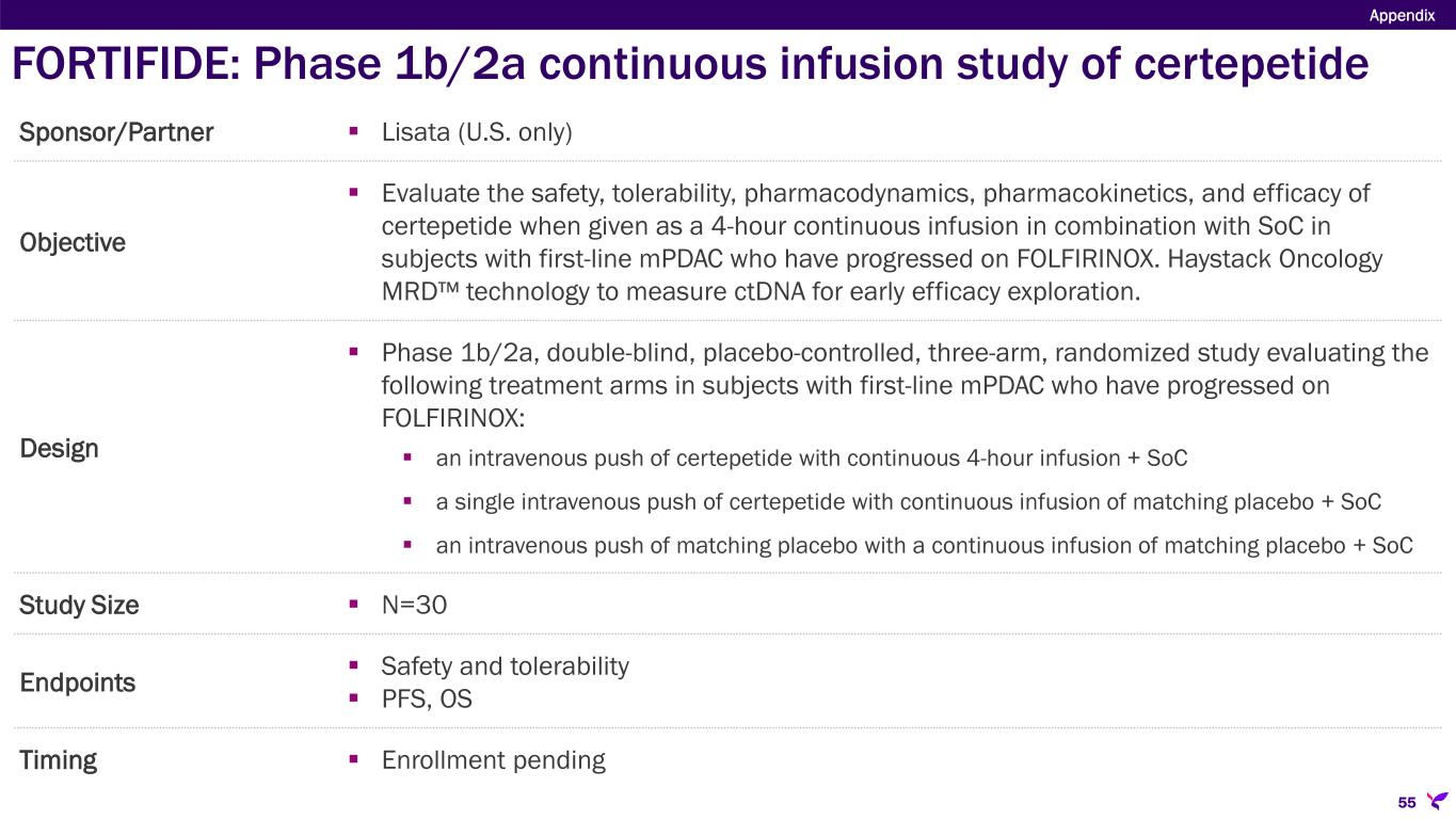 Appendix 55 FORTIFIDE: Phase 1b/2a continuous infusion study of certepetide Sponsor/Partner  Lisata (U.S. only) Objective  Evaluate the safety, tolerability, pharmacodynamics, pharmacokinetics, and efficacy of certepetide when given as a 4-hour continuous infusion in combination with SoC in subjects with first-line mPDAC who have progressed on FOLFIRINOX. Haystack Oncology MRD technology to measure ctDNA for early efficacy exploration. Design  Phase 1b/2a, double-blind, placebo-controlled, three-arm, randomized study evaluating the following treatment arms in subjects with first-line mPDAC who have progressed on FOLFIRINOX:  an intravenous push of certepetide with continuous 4-hour infusion + SoC  a single intravenous push of certepetide with continuous infusion of matching placebo + SoC  an intravenous push of matching placebo with a continuous infusion of matching placebo + SoC Study Size  N=30 Endpoints  Safety and tolerability  PFS, OS Timing  Enrollment pending