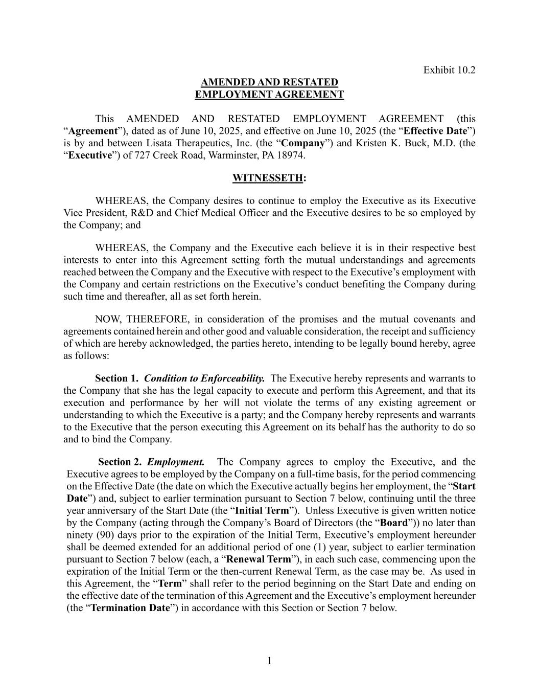 1 Exhibit 10.2 AMENDED AND RESTATED EMPLOYMENT AGREEMENT This AMENDED AND RESTATED EMPLOYMENT AGREEMENT (this “Agreement”), dated as of June 10, 2025, and effective on June 10, 2025 (the “Effective Date”) is by and between Lisata Therapeutics, Inc. (the “Company”) and Kristen K. Buck, M.D. (the “Executive”) of 727 Creek Road, Warminster, PA 18974. WITNESSETH: WHEREAS, the Company desires to continue to employ the Executive as its Executive Vice President, R&D and Chief Medical Officer and the Executive desires to be so employed by the Company; and WHEREAS, the Company and the Executive each believe it is in their respective best interests to enter into this Agreement setting forth the mutual understandings and agreements reached between the Company and the Executive with respect to the Executive’s employment with the Company and certain restrictions on the Executive’s conduct benefiting the Company during such time and thereafter, all as set forth herein. NOW, THEREFORE, in consideration of the promises and the mutual covenants and agreements contained herein and other good and valuable consideration, the receipt and sufficiency of which are hereby acknowledged, the parties hereto, intending to be legally bound hereby, agree as follows: Section 1. Condition to Enforceability. The Executive hereby represents and warrants to the Company that she has the legal capacity to execute and perform this Agreement, and that its execution and performance by her will not violate the terms of any existing agreement or understanding to which the Executive is a party; and the Company hereby represents and warrants to the Executive that the person executing this Agreement on its behalf has the authority to do so and to bind the Company. Section 2. Employment. The Company agrees to employ the Executive, and the Executive agrees to be employed by the Company on a full-time basis, for the period commencing on the Effective Date (the date on which the Executive actually begins her employment, the “Start Date”) and, subject to earlier termination pursuant to Section 7 below, continuing until the three year anniversary of the Start Date (the “Initial Term”). Unless Executive is given written notice by the Company (acting through the Company’s Board of Directors (the “Board”)) no later than ninety (90) days prior to the expiration of the Initial Term, Executive’s employment hereunder shall be deemed extended for an additional period of one (1) year, subject to earlier termination pursuant to Section 7 below (each, a “Renewal Term”), in each such case, commencing upon the expiration of the Initial Term or the then-current Renewal Term, as the case may be. As used in this Agreement, the “Term” shall refer to the period beginning on the Start Date and ending on the effective date of the termination of this Agreement and the Executive’s employment hereunder (the “Termination Date”) in accordance with this Section or Section 7 below.