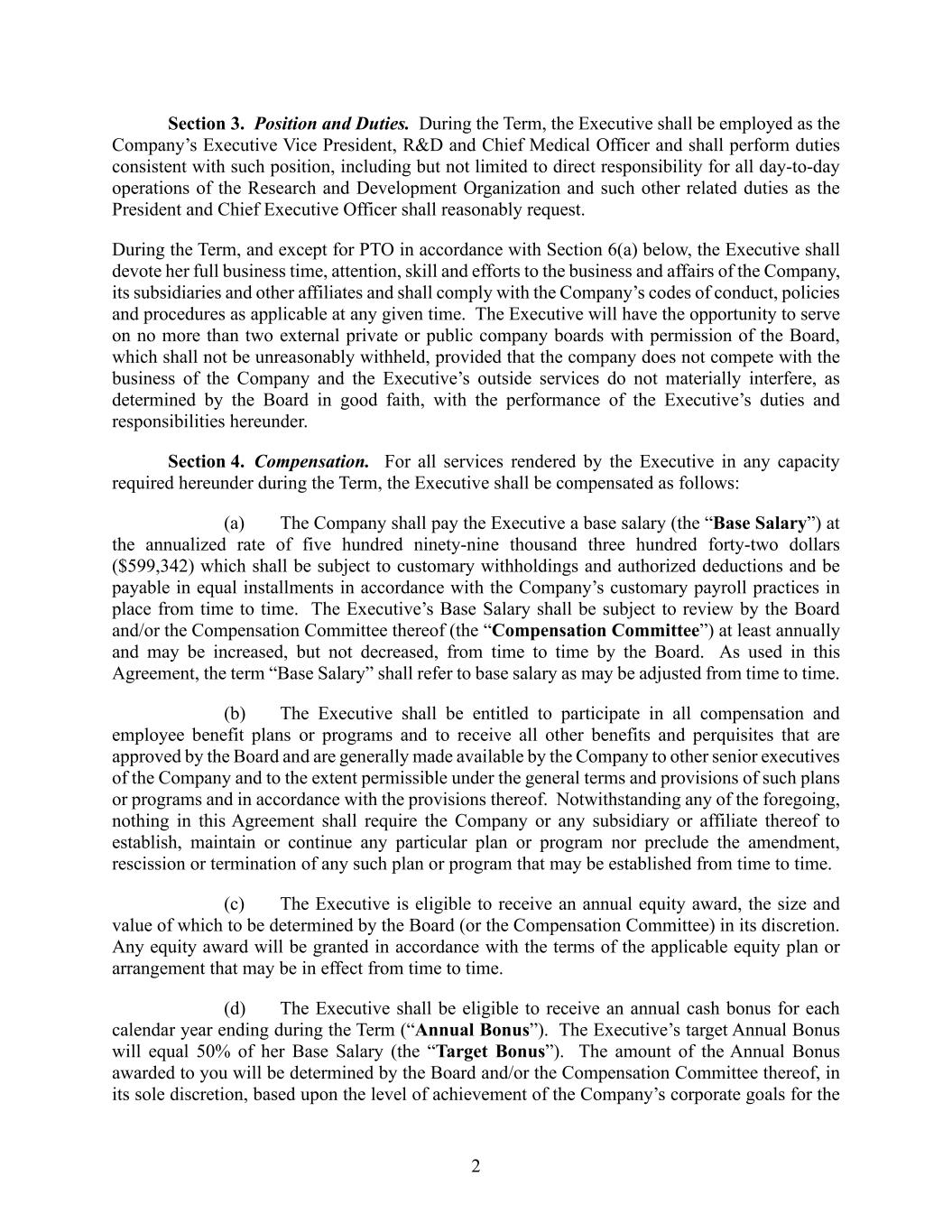 2 Section 3. Position and Duties. During the Term, the Executive shall be employed as the Company’s Executive Vice President, R&D and Chief Medical Officer and shall perform duties consistent with such position, including but not limited to direct responsibility for all day-to-day operations of the Research and Development Organization and such other related duties as the President and Chief Executive Officer shall reasonably request. During the Term, and except for PTO in accordance with Section 6(a) below, the Executive shall devote her full business time, attention, skill and efforts to the business and affairs of the Company, its subsidiaries and other affiliates and shall comply with the Company’s codes of conduct, policies and procedures as applicable at any given time. The Executive will have the opportunity to serve on no more than two external private or public company boards with permission of the Board, which shall not be unreasonably withheld, provided that the company does not compete with the business of the Company and the Executive’s outside services do not materially interfere, as determined by the Board in good faith, with the performance of the Executive’s duties and responsibilities hereunder. Section 4. Compensation. For all services rendered by the Executive in any capacity required hereunder during the Term, the Executive shall be compensated as follows: (a) The Company shall pay the Executive a base salary (the “Base Salary”) at the annualized rate of five hundred ninety-nine thousand three hundred forty-two dollars ($599,342) which shall be subject to customary withholdings and authorized deductions and be payable in equal installments in accordance with the Company’s customary payroll practices in place from time to time. The Executive’s Base Salary shall be subject to review by the Board and/or the Compensation Committee thereof (the “Compensation Committee”) at least annually and may be increased, but not decreased, from time to time by the Board. As used in this Agreement, the term “Base Salary” shall refer to base salary as may be adjusted from time to time. (b) The Executive shall be entitled to participate in all compensation and employee benefit plans or programs and to receive all other benefits and perquisites that are approved by the Board and are generally made available by the Company to other senior executives of the Company and to the extent permissible under the general terms and provisions of such plans or programs and in accordance with the provisions thereof. Notwithstanding any of the foregoing, nothing in this Agreement shall require the Company or any subsidiary or affiliate thereof to establish, maintain or continue any particular plan or program nor preclude the amendment, rescission or termination of any such plan or program that may be established from time to time. (c) The Executive is eligible to receive an annual equity award, the size and value of which to be determined by the Board (or the Compensation Committee) in its discretion. Any equity award will be granted in accordance with the terms of the applicable equity plan or arrangement that may be in effect from time to time. (d) The Executive shall be eligible to receive an annual cash bonus for each calendar year ending during the Term (“Annual Bonus”). The Executive’s target Annual Bonus will equal 50% of her Base Salary (the “Target Bonus”). The amount of the Annual Bonus awarded to you will be determined by the Board and/or the Compensation Committee thereof, in its sole discretion, based upon the level of achievement of the Company’s corporate goals for the