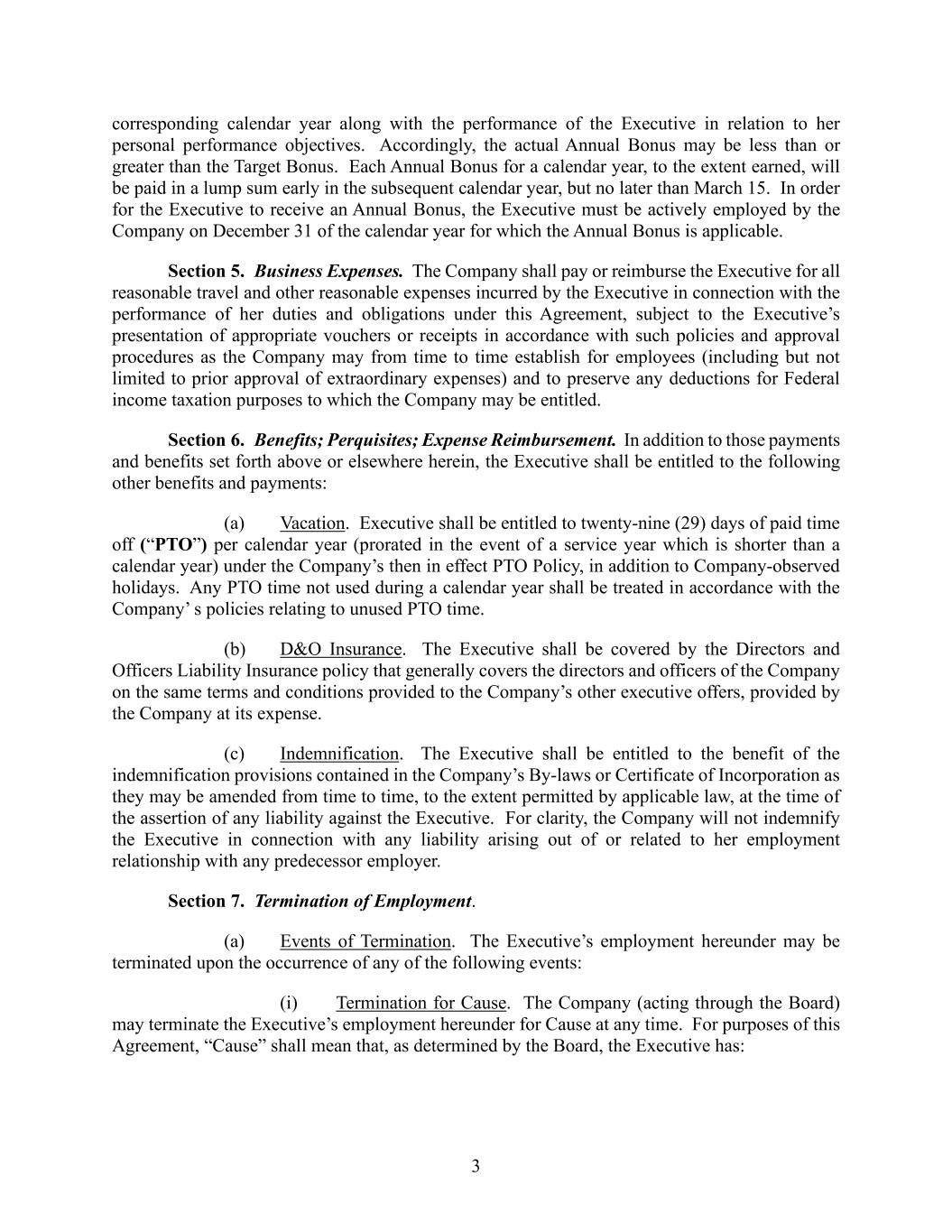 3 corresponding calendar year along with the performance of the Executive in relation to her personal performance objectives. Accordingly, the actual Annual Bonus may be less than or greater than the Target Bonus. Each Annual Bonus for a calendar year, to the extent earned, will be paid in a lump sum early in the subsequent calendar year, but no later than March 15. In order for the Executive to receive an Annual Bonus, the Executive must be actively employed by the Company on December 31 of the calendar year for which the Annual Bonus is applicable. Section 5. Business Expenses. The Company shall pay or reimburse the Executive for all reasonable travel and other reasonable expenses incurred by the Executive in connection with the performance of her duties and obligations under this Agreement, subject to the Executive’s presentation of appropriate vouchers or receipts in accordance with such policies and approval procedures as the Company may from time to time establish for employees (including but not limited to prior approval of extraordinary expenses) and to preserve any deductions for Federal income taxation purposes to which the Company may be entitled. Section 6. Benefits; Perquisites; Expense Reimbursement. In addition to those payments and benefits set forth above or elsewhere herein, the Executive shall be entitled to the following other benefits and payments: (a) Vacation. Executive shall be entitled to twenty-nine (29) days of paid time off (“PTO”) per calendar year (prorated in the event of a service year which is shorter than a calendar year) under the Company’s then in effect PTO Policy, in addition to Company-observed holidays. Any PTO time not used during a calendar year shall be treated in accordance with the Company’ s policies relating to unused PTO time. (b) D&O Insurance. The Executive shall be covered by the Directors and Officers Liability Insurance policy that generally covers the directors and officers of the Company on the same terms and conditions provided to the Company’s other executive offers, provided by the Company at its expense. (c) Indemnification. The Executive shall be entitled to the benefit of the indemnification provisions contained in the Company’s By-laws or Certificate of Incorporation as they may be amended from time to time, to the extent permitted by applicable law, at the time of the assertion of any liability against the Executive. For clarity, the Company will not indemnify the Executive in connection with any liability arising out of or related to her employment relationship with any predecessor employer. Section 7. Termination of Employment. (a) Events of Termination. The Executive’s employment hereunder may be terminated upon the occurrence of any of the following events: (i) Termination for Cause. The Company (acting through the Board) may terminate the Executive’s employment hereunder for Cause at any time. For purposes of this Agreement, “Cause” shall mean that, as determined by the Board, the Executive has: