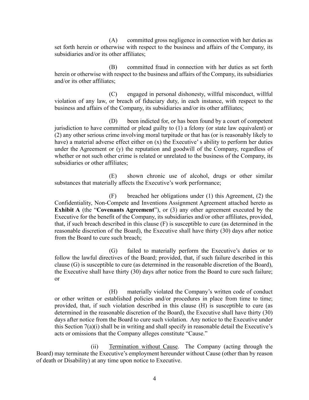 4 (A) committed gross negligence in connection with her duties as set forth herein or otherwise with respect to the business and affairs of the Company, its subsidiaries and/or its other affiliates; (B) committed fraud in connection with her duties as set forth herein or otherwise with respect to the business and affairs of the Company, its subsidiaries and/or its other affiliates; (C) engaged in personal dishonesty, willful misconduct, willful violation of any law, or breach of fiduciary duty, in each instance, with respect to the business and affairs of the Company, its subsidiaries and/or its other affiliates; (D) been indicted for, or has been found by a court of competent jurisdiction to have committed or plead guilty to (1) a felony (or state law equivalent) or (2) any other serious crime involving moral turpitude or that has (or is reasonably likely to have) a material adverse effect either on (x) the Executive’ s ability to perform her duties under the Agreement or (y) the reputation and goodwill of the Company, regardless of whether or not such other crime is related or unrelated to the business of the Company, its subsidiaries or other affiliates; (E) shown chronic use of alcohol, drugs or other similar substances that materially affects the Executive’s work performance; (F) breached her obligations under (1) this Agreement, (2) the Confidentiality, Non-Compete and Inventions Assignment Agreement attached hereto as Exhibit A (the “Covenants Agreement”), or (3) any other agreement executed by the Executive for the benefit of the Company, its subsidiaries and/or other affiliates, provided, that, if such breach described in this clause (F) is susceptible to cure (as determined in the reasonable discretion of the Board), the Executive shall have thirty (30) days after notice from the Board to cure such breach; (G) failed to materially perform the Executive’s duties or to follow the lawful directives of the Board; provided, that, if such failure described in this clause (G) is susceptible to cure (as determined in the reasonable discretion of the Board), the Executive shall have thirty (30) days after notice from the Board to cure such failure; or (H) materially violated the Company’s written code of conduct or other written or established policies and/or procedures in place from time to time; provided, that, if such violation described in this clause (H) is susceptible to cure (as determined in the reasonable discretion of the Board), the Executive shall have thirty (30) days after notice from the Board to cure such violation. Any notice to the Executive under this Section 7(a)(i) shall be in writing and shall specify in reasonable detail the Executive’s acts or omissions that the Company alleges constitute “Cause.” (ii) Termination without Cause. The Company (acting through the Board) may terminate the Executive’s employment hereunder without Cause (other than by reason of death or Disability) at any time upon notice to Executive.
