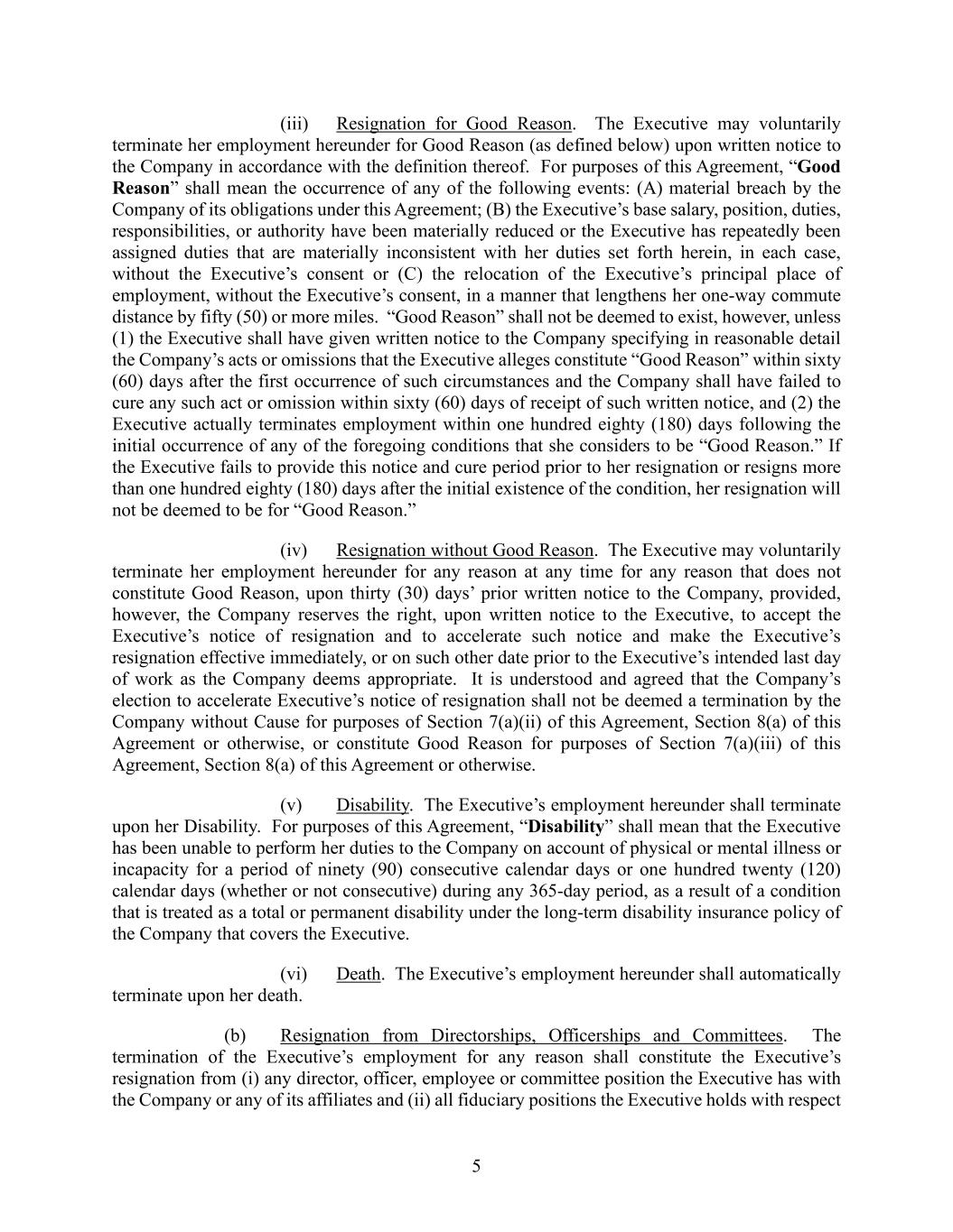 5 (iii) Resignation for Good Reason. The Executive may voluntarily terminate her employment hereunder for Good Reason (as defined below) upon written notice to the Company in accordance with the definition thereof. For purposes of this Agreement, “Good Reason” shall mean the occurrence of any of the following events: (A) material breach by the Company of its obligations under this Agreement; (B) the Executive’s base salary, position, duties, responsibilities, or authority have been materially reduced or the Executive has repeatedly been assigned duties that are materially inconsistent with her duties set forth herein, in each case, without the Executive’s consent or (C) the relocation of the Executive’s principal place of employment, without the Executive’s consent, in a manner that lengthens her one-way commute distance by fifty (50) or more miles. “Good Reason” shall not be deemed to exist, however, unless (1) the Executive shall have given written notice to the Company specifying in reasonable detail the Company’s acts or omissions that the Executive alleges constitute “Good Reason” within sixty (60) days after the first occurrence of such circumstances and the Company shall have failed to cure any such act or omission within sixty (60) days of receipt of such written notice, and (2) the Executive actually terminates employment within one hundred eighty (180) days following the initial occurrence of any of the foregoing conditions that she considers to be “Good Reason.” If the Executive fails to provide this notice and cure period prior to her resignation or resigns more than one hundred eighty (180) days after the initial existence of the condition, her resignation will not be deemed to be for “Good Reason.” (iv) Resignation without Good Reason. The Executive may voluntarily terminate her employment hereunder for any reason at any time for any reason that does not constitute Good Reason, upon thirty (30) days’ prior written notice to the Company, provided, however, the Company reserves the right, upon written notice to the Executive, to accept the Executive’s notice of resignation and to accelerate such notice and make the Executive’s resignation effective immediately, or on such other date prior to the Executive’s intended last day of work as the Company deems appropriate. It is understood and agreed that the Company’s election to accelerate Executive’s notice of resignation shall not be deemed a termination by the Company without Cause for purposes of Section 7(a)(ii) of this Agreement, Section 8(a) of this Agreement or otherwise, or constitute Good Reason for purposes of Section 7(a)(iii) of this Agreement, Section 8(a) of this Agreement or otherwise. (v) Disability. The Executive’s employment hereunder shall terminate upon her Disability. For purposes of this Agreement, “Disability” shall mean that the Executive has been unable to perform her duties to the Company on account of physical or mental illness or incapacity for a period of ninety (90) consecutive calendar days or one hundred twenty (120) calendar days (whether or not consecutive) during any 365-day period, as a result of a condition that is treated as a total or permanent disability under the long-term disability insurance policy of the Company that covers the Executive. (vi) Death. The Executive’s employment hereunder shall automatically terminate upon her death. (b) Resignation from Directorships, Officerships and Committees. The termination of the Executive’s employment for any reason shall constitute the Executive’s resignation from (i) any director, officer, employee or committee position the Executive has with the Company or any of its affiliates and (ii) all fiduciary positions the Executive holds with respect