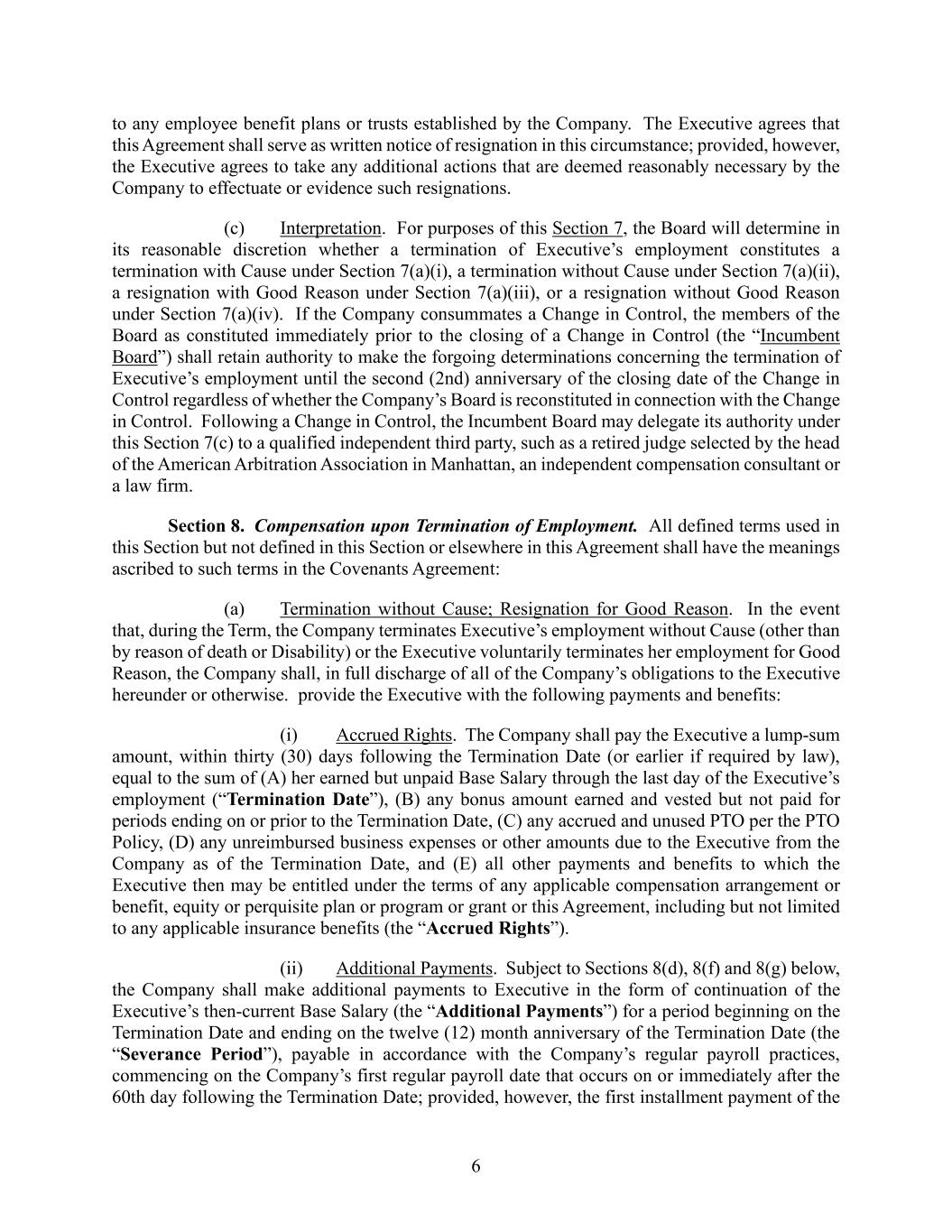 6 to any employee benefit plans or trusts established by the Company. The Executive agrees that this Agreement shall serve as written notice of resignation in this circumstance; provided, however, the Executive agrees to take any additional actions that are deemed reasonably necessary by the Company to effectuate or evidence such resignations. (c) Interpretation. For purposes of this Section 7, the Board will determine in its reasonable discretion whether a termination of Executive’s employment constitutes a termination with Cause under Section 7(a)(i), a termination without Cause under Section 7(a)(ii), a resignation with Good Reason under Section 7(a)(iii), or a resignation without Good Reason under Section 7(a)(iv). If the Company consummates a Change in Control, the members of the Board as constituted immediately prior to the closing of a Change in Control (the “Incumbent Board”) shall retain authority to make the forgoing determinations concerning the termination of Executive’s employment until the second (2nd) anniversary of the closing date of the Change in Control regardless of whether the Company’s Board is reconstituted in connection with the Change in Control. Following a Change in Control, the Incumbent Board may delegate its authority under this Section 7(c) to a qualified independent third party, such as a retired judge selected by the head of the American Arbitration Association in Manhattan, an independent compensation consultant or a law firm. Section 8. Compensation upon Termination of Employment. All defined terms used in this Section but not defined in this Section or elsewhere in this Agreement shall have the meanings ascribed to such terms in the Covenants Agreement: (a) Termination without Cause; Resignation for Good Reason. In the event that, during the Term, the Company terminates Executive’s employment without Cause (other than by reason of death or Disability) or the Executive voluntarily terminates her employment for Good Reason, the Company shall, in full discharge of all of the Company’s obligations to the Executive hereunder or otherwise. provide the Executive with the following payments and benefits: (i) Accrued Rights. The Company shall pay the Executive a lump-sum amount, within thirty (30) days following the Termination Date (or earlier if required by law), equal to the sum of (A) her earned but unpaid Base Salary through the last day of the Executive’s employment (“Termination Date”), (B) any bonus amount earned and vested but not paid for periods ending on or prior to the Termination Date, (C) any accrued and unused PTO per the PTO Policy, (D) any unreimbursed business expenses or other amounts due to the Executive from the Company as of the Termination Date, and (E) all other payments and benefits to which the Executive then may be entitled under the terms of any applicable compensation arrangement or benefit, equity or perquisite plan or program or grant or this Agreement, including but not limited to any applicable insurance benefits (the “Accrued Rights”). (ii) Additional Payments. Subject to Sections 8(d), 8(f) and 8(g) below, the Company shall make additional payments to Executive in the form of continuation of the Executive’s then-current Base Salary (the “Additional Payments”) for a period beginning on the Termination Date and ending on the twelve (12) month anniversary of the Termination Date (the “Severance Period”), payable in accordance with the Company’s regular payroll practices, commencing on the Company’s first regular payroll date that occurs on or immediately after the 60th day following the Termination Date; provided, however, the first installment payment of the
