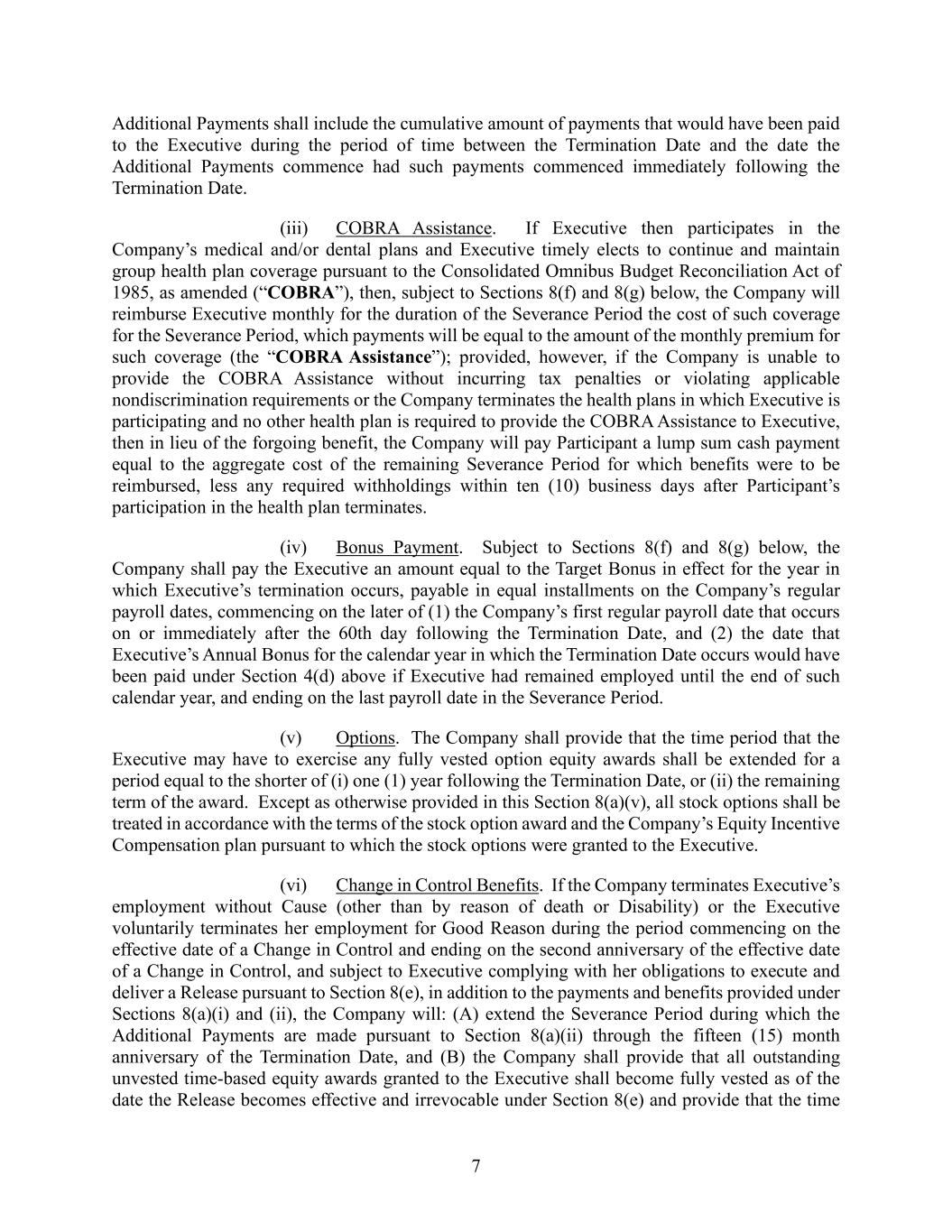 7 Additional Payments shall include the cumulative amount of payments that would have been paid to the Executive during the period of time between the Termination Date and the date the Additional Payments commence had such payments commenced immediately following the Termination Date. (iii) COBRA Assistance. If Executive then participates in the Company’s medical and/or dental plans and Executive timely elects to continue and maintain group health plan coverage pursuant to the Consolidated Omnibus Budget Reconciliation Act of 1985, as amended (“COBRA”), then, subject to Sections 8(f) and 8(g) below, the Company will reimburse Executive monthly for the duration of the Severance Period the cost of such coverage for the Severance Period, which payments will be equal to the amount of the monthly premium for such coverage (the “COBRA Assistance”); provided, however, if the Company is unable to provide the COBRA Assistance without incurring tax penalties or violating applicable nondiscrimination requirements or the Company terminates the health plans in which Executive is participating and no other health plan is required to provide the COBRA Assistance to Executive, then in lieu of the forgoing benefit, the Company will pay Participant a lump sum cash payment equal to the aggregate cost of the remaining Severance Period for which benefits were to be reimbursed, less any required withholdings within ten (10) business days after Participant’s participation in the health plan terminates. (iv) Bonus Payment. Subject to Sections 8(f) and 8(g) below, the Company shall pay the Executive an amount equal to the Target Bonus in effect for the year in which Executive’s termination occurs, payable in equal installments on the Company’s regular payroll dates, commencing on the later of (1) the Company’s first regular payroll date that occurs on or immediately after the 60th day following the Termination Date, and (2) the date that Executive’s Annual Bonus for the calendar year in which the Termination Date occurs would have been paid under Section 4(d) above if Executive had remained employed until the end of such calendar year, and ending on the last payroll date in the Severance Period. (v) Options. The Company shall provide that the time period that the Executive may have to exercise any fully vested option equity awards shall be extended for a period equal to the shorter of (i) one (1) year following the Termination Date, or (ii) the remaining term of the award. Except as otherwise provided in this Section 8(a)(v), all stock options shall be treated in accordance with the terms of the stock option award and the Company’s Equity Incentive Compensation plan pursuant to which the stock options were granted to the Executive. (vi) Change in Control Benefits. If the Company terminates Executive’s employment without Cause (other than by reason of death or Disability) or the Executive voluntarily terminates her employment for Good Reason during the period commencing on the effective date of a Change in Control and ending on the second anniversary of the effective date of a Change in Control, and subject to Executive complying with her obligations to execute and deliver a Release pursuant to Section 8(e), in addition to the payments and benefits provided under Sections 8(a)(i) and (ii), the Company will: (A) extend the Severance Period during which the Additional Payments are made pursuant to Section 8(a)(ii) through the fifteen (15) month anniversary of the Termination Date, and (B) the Company shall provide that all outstanding unvested time-based equity awards granted to the Executive shall become fully vested as of the date the Release becomes effective and irrevocable under Section 8(e) and provide that the time