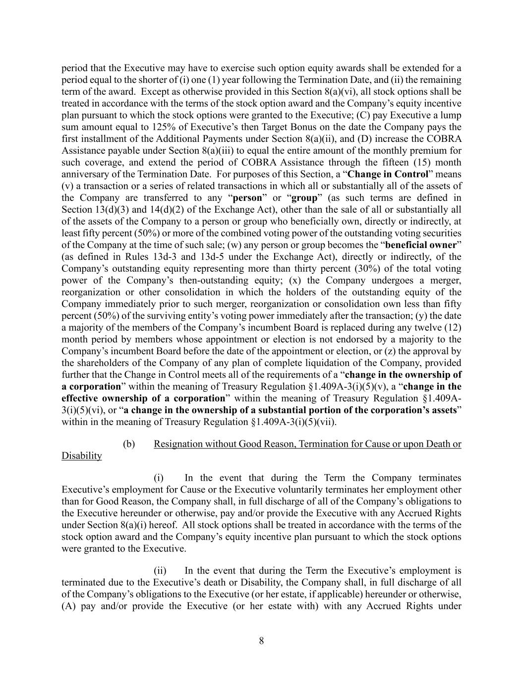 8 period that the Executive may have to exercise such option equity awards shall be extended for a period equal to the shorter of (i) one (1) year following the Termination Date, and (ii) the remaining term of the award. Except as otherwise provided in this Section 8(a)(vi), all stock options shall be treated in accordance with the terms of the stock option award and the Company’s equity incentive plan pursuant to which the stock options were granted to the Executive; (C) pay Executive a lump sum amount equal to 125% of Executive’s then Target Bonus on the date the Company pays the first installment of the Additional Payments under Section 8(a)(ii), and (D) increase the COBRA Assistance payable under Section 8(a)(iii) to equal the entire amount of the monthly premium for such coverage, and extend the period of COBRA Assistance through the fifteen (15) month anniversary of the Termination Date. For purposes of this Section, a “Change in Control” means (v) a transaction or a series of related transactions in which all or substantially all of the assets of the Company are transferred to any “person” or “group” (as such terms are defined in Section 13(d)(3) and 14(d)(2) of the Exchange Act), other than the sale of all or substantially all of the assets of the Company to a person or group who beneficially own, directly or indirectly, at least fifty percent (50%) or more of the combined voting power of the outstanding voting securities of the Company at the time of such sale; (w) any person or group becomes the “beneficial owner” (as defined in Rules 13d-3 and 13d-5 under the Exchange Act), directly or indirectly, of the Company’s outstanding equity representing more than thirty percent (30%) of the total voting power of the Company’s then-outstanding equity; (x) the Company undergoes a merger, reorganization or other consolidation in which the holders of the outstanding equity of the Company immediately prior to such merger, reorganization or consolidation own less than fifty percent (50%) of the surviving entity’s voting power immediately after the transaction; (y) the date a majority of the members of the Company’s incumbent Board is replaced during any twelve (12) month period by members whose appointment or election is not endorsed by a majority to the Company’s incumbent Board before the date of the appointment or election, or (z) the approval by the shareholders of the Company of any plan of complete liquidation of the Company, provided further that the Change in Control meets all of the requirements of a “change in the ownership of a corporation” within the meaning of Treasury Regulation §1.409A-3(i)(5)(v), a “change in the effective ownership of a corporation” within the meaning of Treasury Regulation §1.409A- 3(i)(5)(vi), or “a change in the ownership of a substantial portion of the corporation’s assets” within in the meaning of Treasury Regulation §1.409A-3(i)(5)(vii). (b) Resignation without Good Reason, Termination for Cause or upon Death or Disability (i) In the event that during the Term the Company terminates Executive’s employment for Cause or the Executive voluntarily terminates her employment other than for Good Reason, the Company shall, in full discharge of all of the Company’s obligations to the Executive hereunder or otherwise, pay and/or provide the Executive with any Accrued Rights under Section 8(a)(i) hereof. All stock options shall be treated in accordance with the terms of the stock option award and the Company’s equity incentive plan pursuant to which the stock options were granted to the Executive. (ii) In the event that during the Term the Executive’s employment is terminated due to the Executive’s death or Disability, the Company shall, in full discharge of all of the Company’s obligations to the Executive (or her estate, if applicable) hereunder or otherwise, (A) pay and/or provide the Executive (or her estate with) with any Accrued Rights under